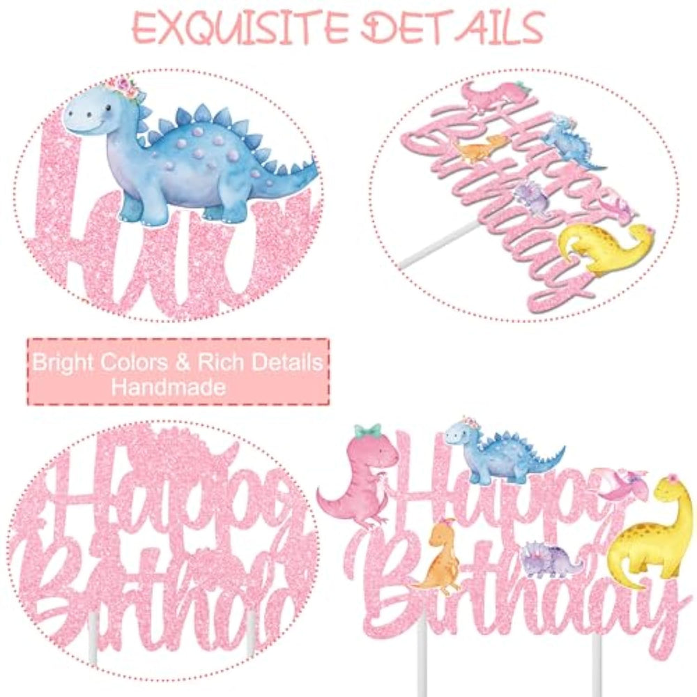 | Dinosaur Birthday Cake Topper: Handmade Cake Topper Featuring Adorable Dinosaur Characters In Pink, Blue, Yellow, And Orange With Glitter Text Decoration | | Dinosaur Birthday Decoration For Girls: Measures 7.8 Inches Wide By 5.1 Inches Tall, Ideal For Standard Birthday Cakes And Party Centerpieces | | Dinosaur Theme Cake Topper: Constructed With High-Quality Cardboard And Sturdy Stick Supports For Reliable Placement On Cakes And Desserts | | Dino Birthday Party Supplies: Suitable For Girls' Birthday Parties, Baby Showers, And Dinosaur-Themed Celebrations With Its Charming Pastel Color Scheme | | Dinosaur Baby Shower Decorations: Ready To Use Right Out Of The Package - Simply Insert The Support Sticks Into The Topper And Place In Your Cake | |