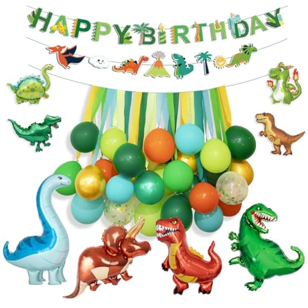 | Dinosaur Birthday Decorations Set Included: 1Pcs “Happy Birthday” Dinosaur Themed Letter Banner, 1Pcs Dinosaur Themed Banner, 2Pcs Leaf Foil Balloon, 8Pcs Dinosaur Foil Balloons, 5Pcs Crepe Paper Streamers (Fruit Green/Green/Light Green/Orange/Blue), 6Pcs 10 Inch Confetti Balloons, 61Pcs Latex Balloons (Green /Orange /Blue /Metallic Gold), 3Pcs Balloon Tools (Balloon Arch Strip, Glue Points, Ribbon). Total 87 Packs, All Decorations For Dinosaur Party You Need Are All In The Package. | | Easy To Assemble: This Dinosaur Party Decorations Boys Pack Contains Balloons, Dinosaurs Birthday Banners And Crepe Paper Streamers And You Don'T Have To Spend Too Much Time Choosing And Matching. This Dinosaur Themed Birthday Decorations For Boys Provides Ribbon, Balloon Arch Strip And Glue Points, So Which Easy To Install. Our Dinosaur Party Supplies Looks More Vivid And Eye-Catching, Attaching Balloons To This Will Be A Fun Home Craft To Assemble With Your Children. | | High Quality Dinosaur Birthday Decorations: Dinosaur Party Decorations Balloons Are Made Of Quality Foil And Strong Latex. Every Dinosaur Party Decorations Balloons Have Been Rigorously Tested And Selected Manually Which Thick Enough And Not Easy To Explode When It Is Inflated, Safe To Use. The Dinosaur Birthday Banner Is Made Of Strong And Elasticity Cardboard And Not Easy To Break, And Our Crepe Paper Is Made Of Tough Materials, Not Easy To Break And Stored For A Long Time. | | Valued Kits: Our Dinosaur Party Decorations Set For Many Scenes: Dinosaur Birthday Party, Jungle Theme Party, Safari Party, Green Theme Party, Baby Shower, Home Garden Decoration, Family Reunions And Other Holiday Decorations. Using This Dinosaur Party Supplies, You Can Experience A Variety Of Different Pleasures And Have A Good Party Time With Your Family And Friends. In Addition, Our Dinosaur Balloon And Banner Have High Quality And Can Use It Repeatedly To Help You Save The Cost Of Living. | | Notes: Children Under 12 Years Old Can Choke On Not Inflated Or Broken Balloons! Parents Supervision Required! Keep Not Inflated Balloons From Children! The Dinosaur Balloons Does Not Pump Too Full, 70% Gas Is Enough. Do Not Vigorously Pinch The Balloon Or Scrape The Balloon Surface With Sharp Objects. In The Process Of Using Dinosaur Party Decorations, If You Have Any Problems, We Will Provide You With The Perfect After-Sales Solution. | |