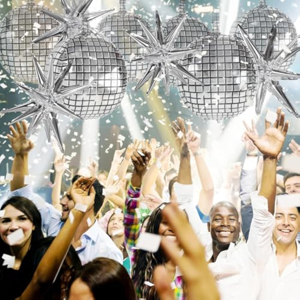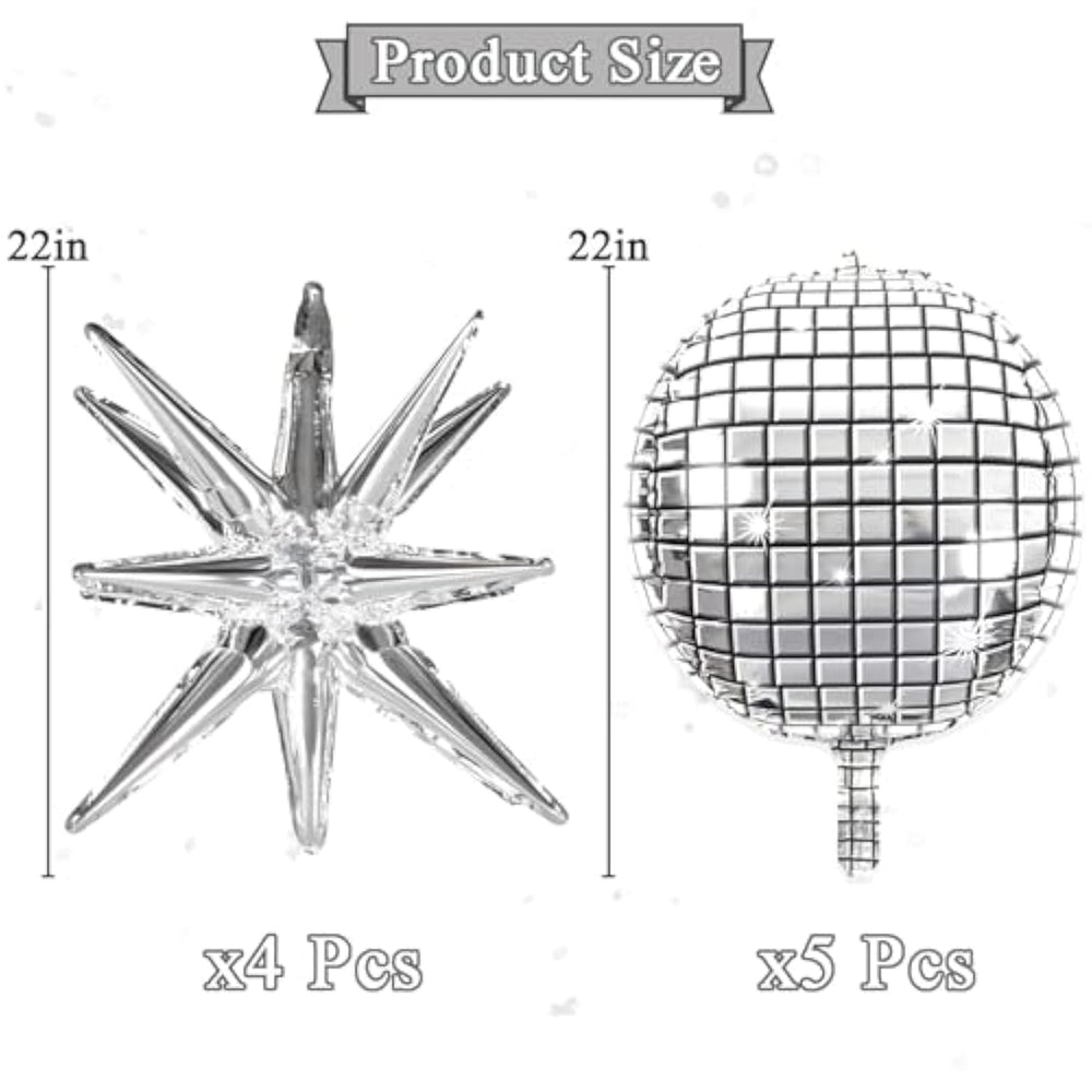 | Groovy Party Pack: Unleash The Disco Fever With Our Set Of 5 Metallic Silver Disco Ball Balloons And 4 Metallic Star Balloons! These Balloons Are A Bold 22 Inches In Size, Making Them The Center Piece Of Your Disco Party Decorations. Disco Balloons Ship Deflated | | Starburst Spectacular: Take Your 70S 80S Party Decor To The Next Level With Our Starburst Balloons! Hang Them, Use Them As Disco Themed Party Decorations, Or Scatter Them Around To Create A Stellar Atmosphere That'Ll Wow Your Guests And Make Your Party Truly Unique | | Perfect For Throwback Vibes: Throw The Ultimate 70S 80S-Themed Bash Or Level Up Your Graduation Party, Disco Cowgirl Party Decorations, Bachelorette/Mamma Mia Party Decorations, 70S 80S 90S Party Decorations, New Year'S Eve Celebration, Or Halloween Bash With These Eye-Catching Disco Balloons | | Top-Notch Quality: Our Big Shiny Silver Disco Balloons 70S Party Decorations Are Known For Their Excellent Quality. Crafted From Durable Mylar Foil Material, These 4D Disco Helium Balloons Are Designed To Withstand The Party Vibes And Stay Strong Throughout Your Celebration | | Easy-Breezy Setup: These Disco Balloons 70S Party Decorations Are A Breeze To Use! Simply Locate The Filling Tab, Insert A Pump Or Straw, And Fill Them With Air. They'Re Self-Sealing, So No Need To Fuss With Tying Knots Just Inflate And Let The Party Begin. Remember To Deflate And Save Them For Future Parties Or Event Decorations | |