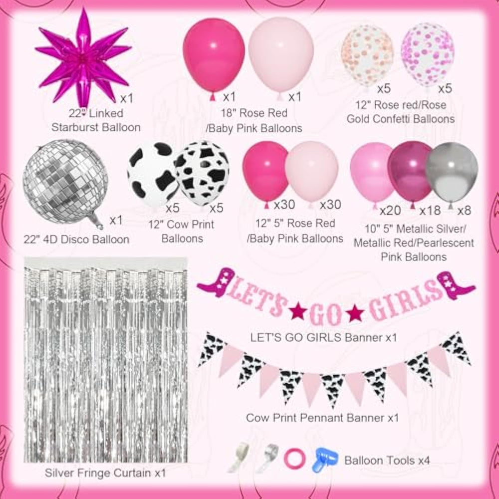 This 137-piece Disco Cowgirl Party Kit has everything you need for a vibrant celebration: silver foil fringe curtains, a cow print pennant banner, a “LET’S GO GIRLS” paper banner, and a mix of balloons in baby pink, hot pink, rose gold confetti, cow print, metallic silver, and pearlescent pink. Perfect for cowgirl-themed birthdays, bachelorette parties, or retro 70s-2000s disco events, these decorations double as fun photo backdrops. The kit includes ribbon, glue dots, and balloon arch strips for easy assembly—great for beginners. Made with high-quality, reusable materials, this set offers a stylish, budget-friendly way to create a memorable party vibe.