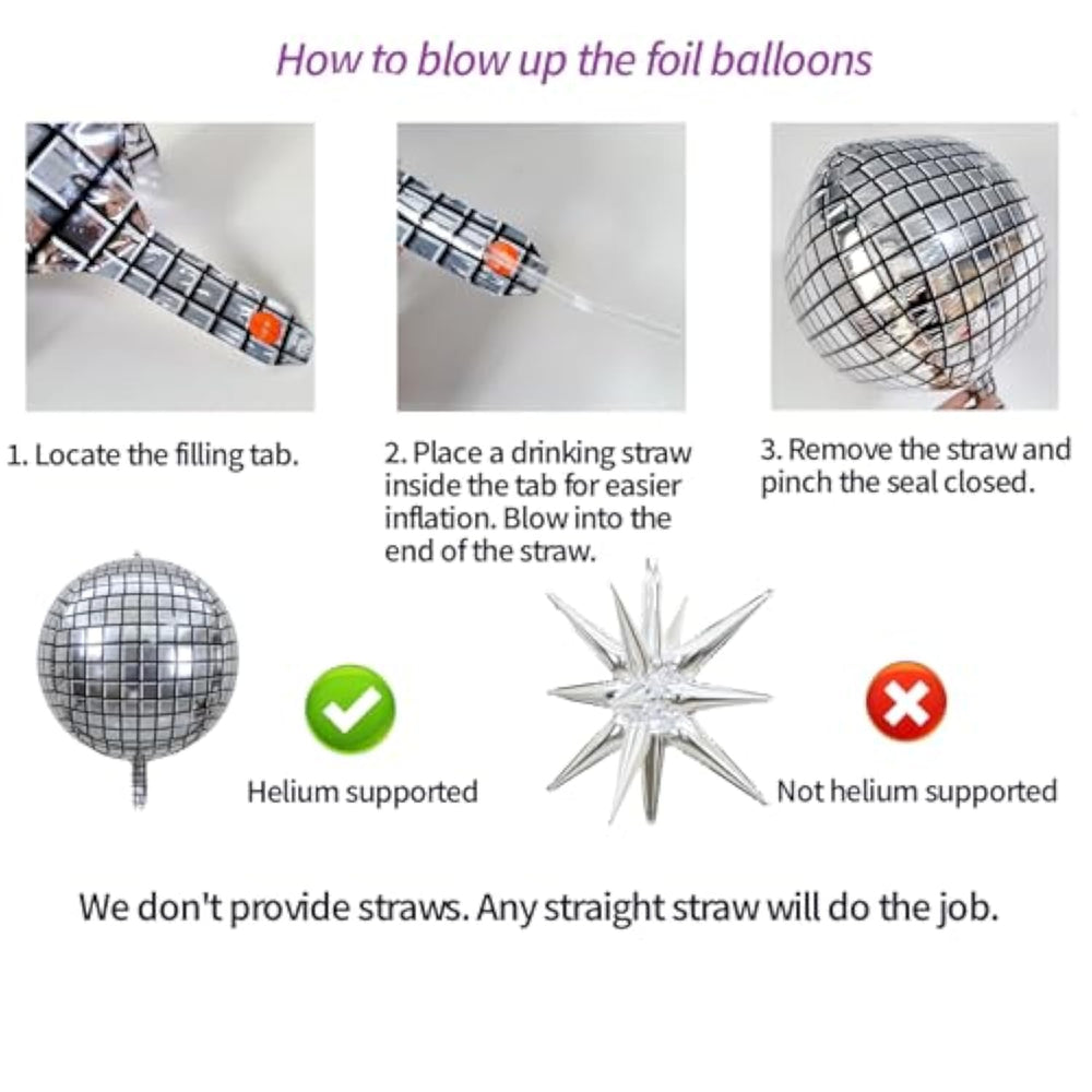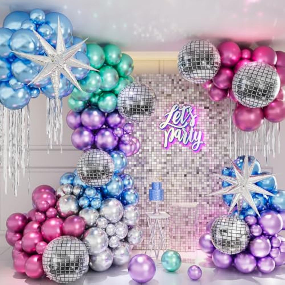 Package Includes: 30 Pcs Metallic Purple Balloons, 30 Pcs Metallic Blue Balloons, 30 Pcs Metallic Hot Pink Balloons, 30 Pcs Metallic Silver Balloons, 30 Pcs Metallic Green Balloons, 5 Pcs Silver Disco Foil Balloons, 2 Pcs Foil Explosion Star Balloons. 16.5Ft Long Strip, 100 Glues, 16.5Ft Long Ribbon | Latex Balloons, Made From Natural Rubber, Are Resistant To Popping | Judiciously Chosen Balloons For A Wonderful Disco Party. Suitable For A Range Of Occasions, Including Birthday Parties, Bachelorette Parties, New Year Parties, 70S 90S 80S Retro Parties, And Holographic Parties | Building A Balloon Arch Isn'T As Hard As You Think, You Don'T Have To Waste Hundreds Of Dollars Hiring Someone To Make A Balloon Arch, Follow The Instructions And You'Ll Be Done Soon | Please Avoid Over Inflation, Overheating And Sharp Objects |