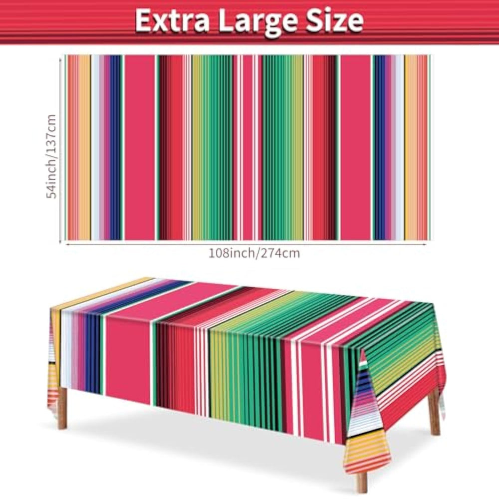 | Size: The Package Include 1Pcs Mexican Table Covers, Each Tablecloth Measures 54 X 108 Inches, Suitable For Tables Seating 8-10 People, Sufficient Quantity And Suitable Size, Can Better Match Your Table, Bring You A Pleasant Dining Experience. | | High Quality Material: The Mexican Party Tablecloth Is Made Of High Quality Plastic Material, Sturdy And Waterproof, Comfortable And Durable, No Shrinkage, No Color Fading, Not Easy To Break Or Tear, No Odor, Safe And Reliable To Use. Mexican Tablecloths Are The Perfect Party Decoration With A Classic Mexican-Style Stripe Pattern And Vivid Psychedelic Colors. | | Perfect Decoration: Mexican Tablecloths Are Perfect Decoration For Mexican Themed Party, Cinco De Mayo Celebration, Birthday Party, Wedding, Baby Shower, Holiday Celebration, Thanksgiving, Christmas, Pool Party And Tribal Party. | | Wide Application: The Mexican Party Table Covers Is Suitable For Table, Curtains, Mantel, Indoor And Outdoor Table, Picnic Rugs And Just Anything You Want To Decorate, Bring A Cheerful And Festive Atmosphere To Your Dining Area. | | Huge Hit For Party: Our Mexican Table Covers Are Ideal For Your Birthday Party, It Will Be A Big Hit At Your Party, Which Also Great As The Party Gifts For Your Friends. The Tablecloths Have A Smooth Surface And Are Easy To Clean, Just Wipe It Clean And Use It Next Time Or Just Throw It Away, Convenient To Save Time For Cleaning After The Party And Let You Enjoy The Party More. | |