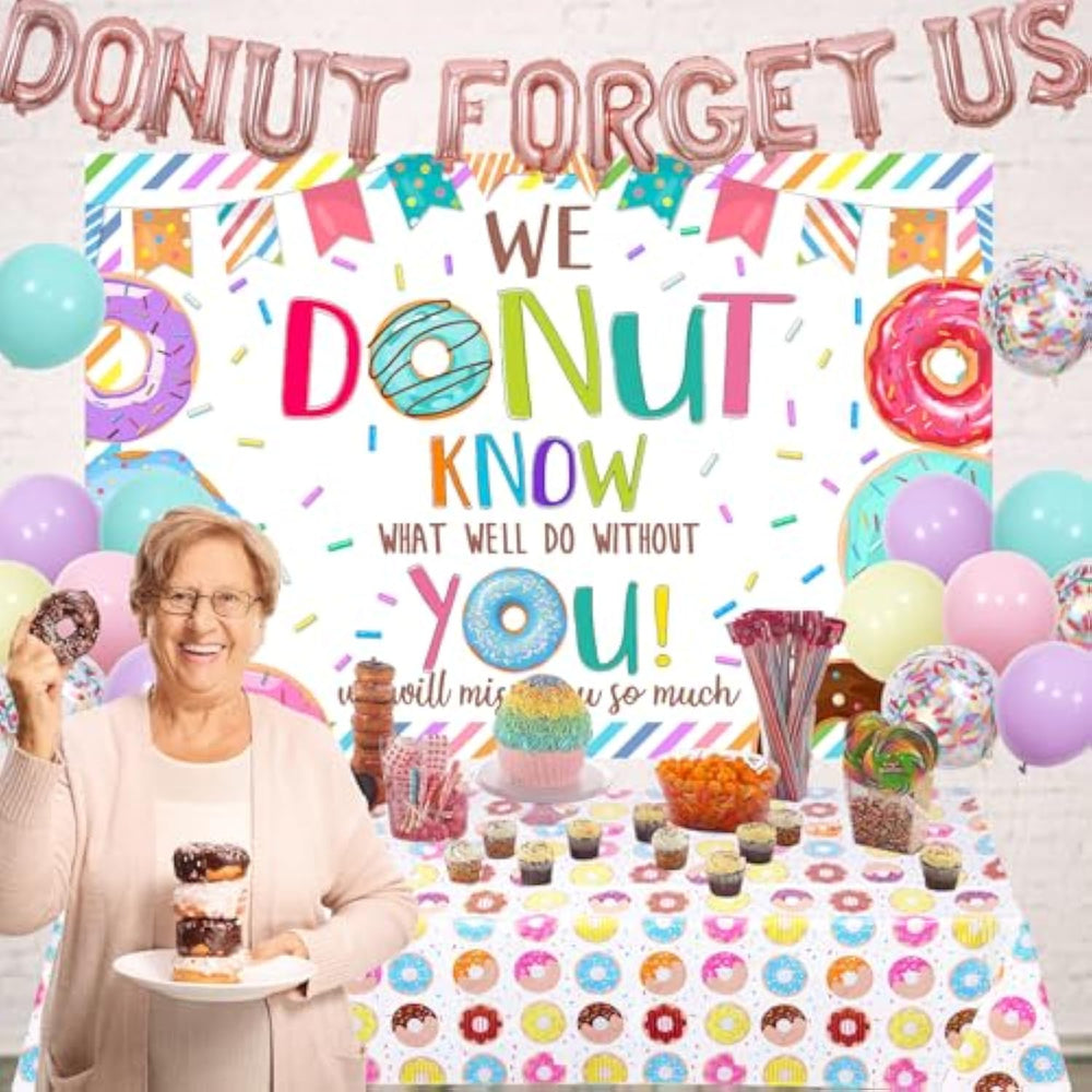 | We Will Miss You So Much: These Donut Farewell Party Decorations Are Designed With Many Cute And Exquisite Doughnut Patterns. Throw A Donut Forget Us Party For Your Office Worker, This Will Be A Life Long Memorable Party! Our Kindness Towards Your Retirement Party Supplies Will Impress Your Friends. It Will Be A Big Shining Point For Your Goodbye Party And Loved By All Guests | | Donut Party Kit: Our Donut Party Decoration Is A Perfect Theme For Any Age. This Donut Going Away Party Decorations Kit Is A Perfect Present For Your Friends Or Family Who Are Going Away. It Will Bring Them A Warm And Happy Feeling And Let Them Know That You Will Miss Them. Additionally, It Will Help You To Express Your Thought - Donut Say Goodbye, We Will Miss You So Much | | Donut Going Away Party Decoration: The Donut Forget Us Party Decorations Kit Includes A Rose Gold Donut Forget Us Balloon Banner, A We Donut Know What We’Ll Do Without You Backdrop, Donut Theme Tablecloth And So On. They Are All Designed With A Cute Donut Pattern, Which Will Create A Sweet And Warm Atmosphere For The Farewell Party | | Wide Application: No Matter How Hard But It’S Time To Say Goodbye To The One Cherished. Our Macaron Donut Forget Us Party Supplies Can Decorate The Party Well. And It Can Display On Many Occasions. They Can Decorate The Graduation, Relocation, Retirement, Farewell Donut Going Away Party And Donut Forget Us Parties | | Package Includes: Choose Our One Stop Donut Going Away Party Decorations Kit. You Will Receive 1 X Donut Forget Us Balloon Banner 16 Inches, 1 X We Do Not Know What We'Ll Do Without You Backdrop 4.92*3.28Ft, 12 X Donut Hanging Swirl, 20 X Balloons 12 Inches(4*Yellow, 4*Pink, 4*Purple, 4*Blue, 4*Confetti) And 1 X Donut Tablecloth 3.5*5.9Ft | |