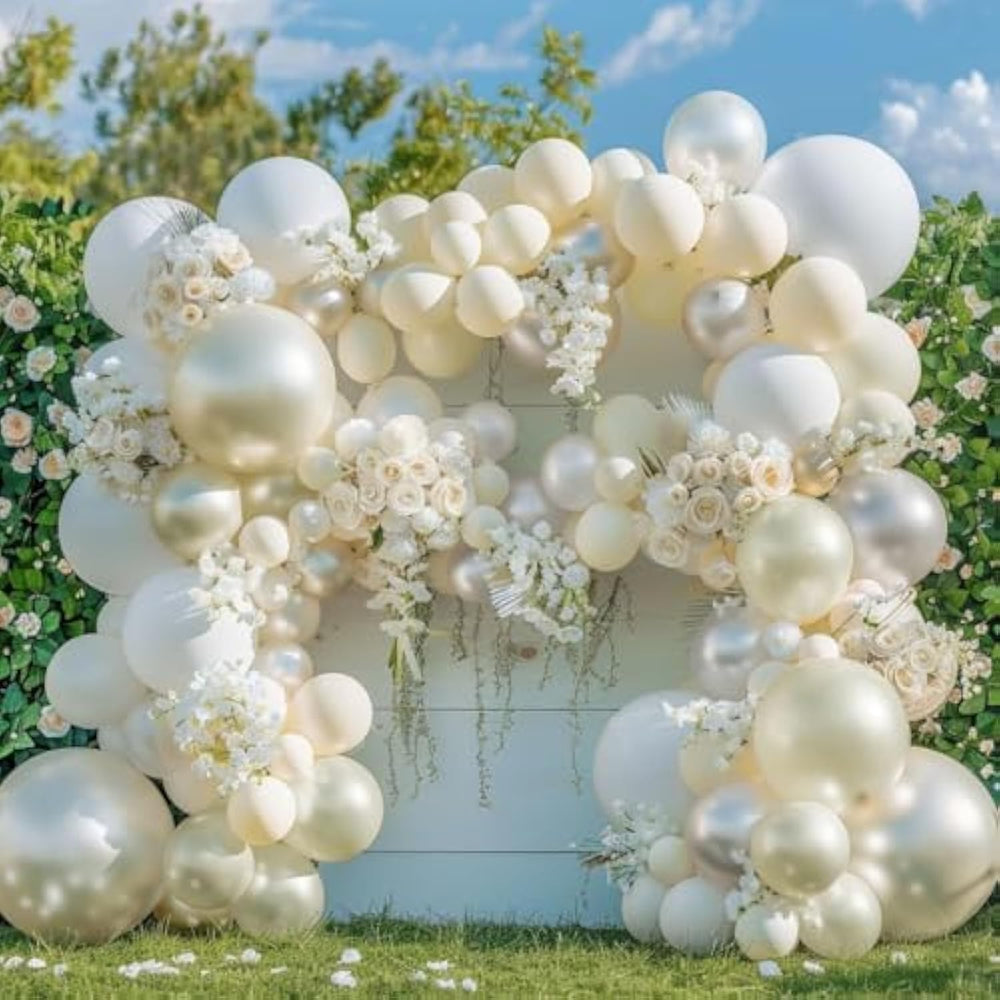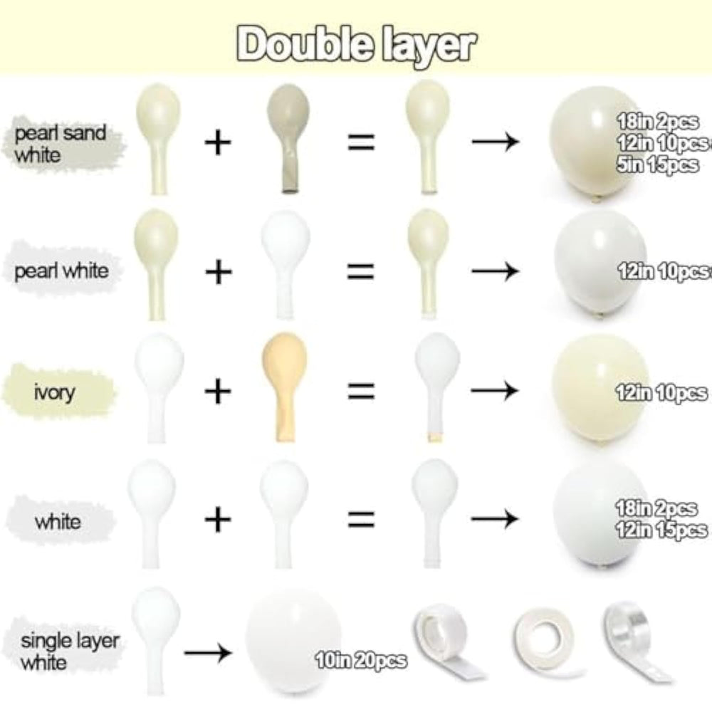 This pearl white balloon arch kit includes a mix of double-stuffed pearl sand white, cream, ivory, and classic white balloons in various sizes, along with essential tools like a balloon strip, glue dots, and curling ribbon—everything needed to create a stunning balloon garland. Made from premium, thick latex, the balloons are non-toxic, safe, and durable, holding their shape for up to 72 hours. Easy to assemble, the kit lets you combine matte and pearl finishes for a soft, elegant look. Perfect for weddings, baby showers, birthdays, anniversaries, and other special events, it adds a romantic and stylish touch to any celebration. For fuller arches, consider using two kits.