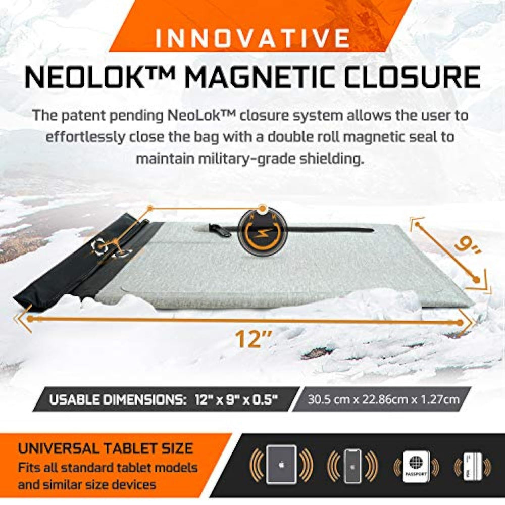 | ? Military-Grade Faraday Dry Bag - Lab Tested And Certified To Shielding Effectiveness Standards Mil-Std-188-125 And Ieee 299-2006. Designed For Military And Law Enforcement Forensics Investigators; Also Used For Grab-And-Go Missions, Government And Executive Travel, Personal Data Security, Digital Privacy, Signal Isolation, Emp/Cme Protection, And Emf Reduction. | | ? Waterproof Exterior - Constructed With Extremely Durable And Waterproof 600D Tpu And 420D Tpu Outer Materials With Welded Seams And Two Layers Of High-Shielding Titanrf Faraday Fabric On All Interior Sides. Used For Shielding Tablets And Small-Medium Size Electronic Devices During Travel, In The Rain, Snow, Sand, Near Contaminants, And Anywhere Near Water. | | ? Rf Signal Blocking Liner - Blocks Wifi (2.4 5Ghz), Bluetooth, Cell Signals Including 5G Networks, Gps, Rfid, And Radio Signals With 60-80Db Average Attenuation. Shields And Accommodates Devices Such As Tablets, Ereaders, Small Laptops, Multiple Cell Phones, Gps Units, Two-Way Radios, Digital Cameras, And Other Electronic Devices. Emi, Rfi, Emf Radiation Shielding. | | ? Neolok Magnetic Closure - Simple And Secure Neolok Closure Consisting Of A Double Roll With A Strong Neodymium Magnetic Seal. Bag Can Easily Open And Close With One Hand. | | ? Universal Tablet Size - Universal Size Accommodates Most Tablet Models. Inner Usage Dimensions (When Bag Is Rolled Closed - Device Must Fit Inside These Dimensions): 12"L X 9"W X 0.5"D. Outer Dimensions (When Bag Is Rolled Closed): 14.5"L X 9.5"W X 0.5"D. | |