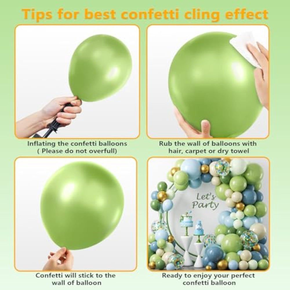 | Super Value Pack : Include 18''(Haze Green Balloons 2, Pastel Blue Balloons 2),12''(Haze Green Balloons 5, Pastel Blue Balloons 5, Sage Green 5, Dusty Blue Balloons 5, Pastel Green Balloons 5, Sand White 5, Confetti Balloons 5), 5''(Haze Green Balloons 10, Pastel Blue Balloons 10, Sage Green 10, Dusty Blue Balloons 10, Pastel Green Balloons 10, Sand White 10, Metallic Gold Balloons 10), Garland Strip X1, 20 Dots Glue X5. | | High Quality : Our Dusty Blue And Green Balloons Made Of Premium Natural Latex, Safe To Use Around Adults And Children. No Holes And Not Easy To Burst, Easy To Use And Inflate And Install Into A Blue And Green Balloon Arch Kit. | | Wide Application : Dazzling Green And Blue Balloons Perfect For Baby Shower Balloons, Weddings, Bridal Shower, Graduation, Engagement, Anniversary, Birthday Party Decorations.It Will Add A Lot Of Charm And Really Bring An Element Of Shine For Your Event. | | Easy To Use Diy Fun : Use These Dusty Green And Dusty Blue Balloon Arch Kit Create A Beautiful Blue And Green Balloon Garland Just Need 30Minutes. You Can Diy Any Style You Like, Everyone Can Easily Complete. | | 24 Hours