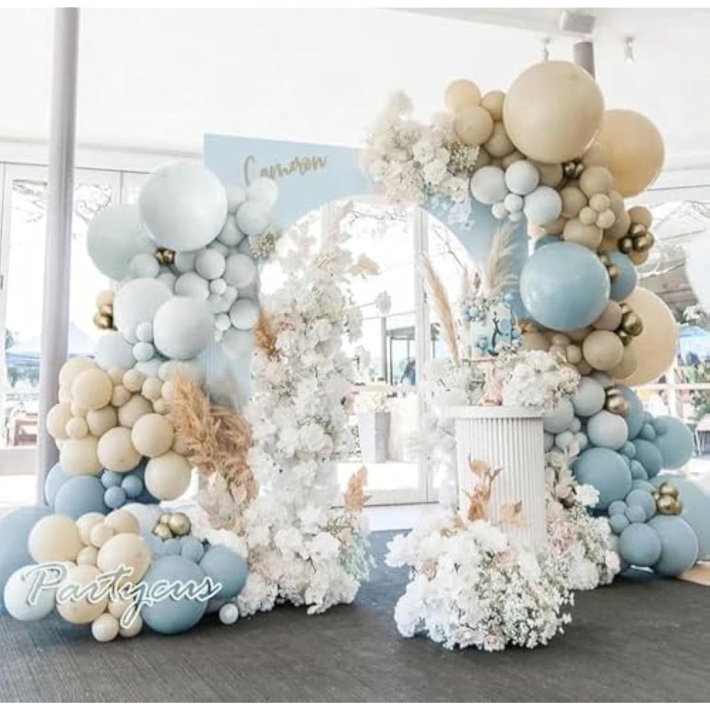 Double Stuffed Balloon Garland - Double Layer Dusty Blue Balloons, Light Baby Blue Balloons And White Sand Balloons Make Up This Baby Shower Balloon Arch; We Add Muted Gold Balloons To Blue Balloon Arch Kit For More Retro Tones; For A Small Birthday Gathering, 1 Slate Blue White Balloon Set Will Do; If You Wanna Make A Rich Pastel Balloon Arch, 2 Double Stuffed Balloon Packs Good To Diy A Bigger Dusty Blue Balloon Garland Display | Dusty Blue Balloon Arch - Double Stuffed Retro Dusty Blue/Slate Blue Balloons(5"10Pcs+12"15Pcs+18"2Pcs),Double Stuffed Light Baby Blue Balloons(5"10Pcs+12"15Pcs),Beige/White Sand Balloons(5"15Pcs+12"15Pcs+18"2Pcs),Gold Metallic Balloons(5"10Pcs),1 Roll Of Balloon Strip Tape, Balloon Glue, And White Ribbon; Diy A Gorgeous Neutral Boho Balloon Garland To Wow Your Guests Has Never Been Easier With This Pastel Blue White Gold Balloons Kit | Reliable Quality - Shade Of Blue And Ivory White Balloons Are Made Of Thick Latex, Have Been Rigorously Tested, Safe To Be Used Around Children; 12In Double Layer Dusty Blue And Light Blue Balloons Weigh 5.6G Each And Can Blow Up As Pictures Showed While Single-Layer Beige And Gold Balloons Have Good Elasticity; Stay Inflated For Up To 72 Hours If Retro Baby Blue Ivory Balloons Are Not Overfilled And Overheated; | Versatile - Create A Stunning Fog Blue Beige Balloon Garland With Ease; Just Inflate The Double Stuffed Balloons, Insert Pastel Blue Cream Balloons Into The Strip, And Shape It With Ribbon And Glue Dots; Hang Over Tables, Doorways, Or Anywhere! Used For Bear Party, Boho Birthday, Wedding, Birdal To Be, Graduation, Gender Reveal, Bachelor, Summer, Beach, Baby Boy, Baptism, Western Party Etc | Attention - Please Do Not Overfill The Double Stuffed Dusty Blue White Balloon Arch Garland Kit And Avoid Sunburn Or Overheating; Double Stuffed Blue Balloon'S Color Would Be A Certain Difference Before And After Inflated. |