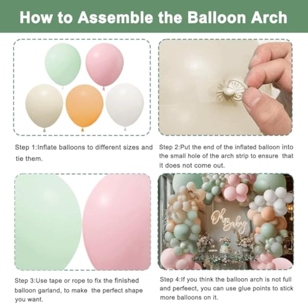 Create a stunning party backdrop with this 144-piece Sage Green and White Balloon Arch Kit. It includes a beautiful mix of sage green, dusty pink, nude, sand white, and matte white balloons, along with essential accessories like glue dots and a balloon strip for easy setup. Made from premium latex, the balloons are thick, durable, and hold their color well. Perfect for boho-themed events, this kit is ideal for baby showers, birthdays, weddings, and more. Whether indoors or outdoors, it's easy to assemble and adds a stylish touch to any celebration.