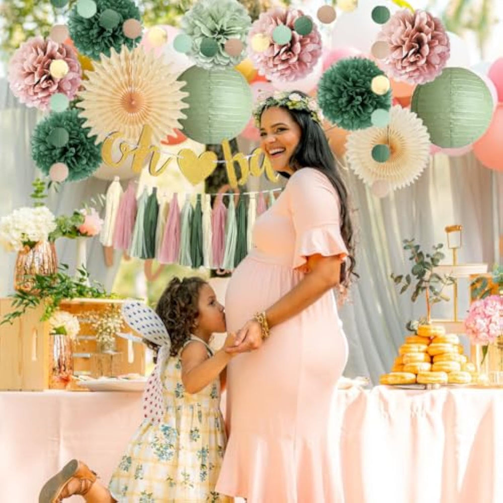 | ?Dusty Rose And Sage Green Baby Shower Decorations Kit? 2Pcs Beige Paper Fans Decorations, 7Pcs Tissue Paper Dusty Rose Pom Poms Olive Green And Sage Green, 2Pcs Sage Green Paper Lanterns, 1Pc Oh Baby Banner Gold, 1Pc Paper Garland Circle Dots, 20Pcs Beige Olive Sage Green And Pink Tassel Garlands. | | ?Diy Joy? In Order To Avoid Any Possible Damage During Transportation, This Dusty Pink And Sage Green Baby Shower Decorations Set Is Packed Flat. You Could Decorate Your Baby Shower Party With Your Family Or Friends To Enjoy A Happy Time Together. | | ?Unique? This Oh Baby Sage Green Baby Shower Decorations Kit Is Super Cool, You Could Use It Anywhere According To Your Need And Your Preference | | ?Material? Paper Fans, Paper Pom Pom Flowers, Paper Lanterns And Tassel Garlands Are Super Light And Fun To Use. | | ?Satisfaction? If The Boho Sage Green And Pink Baby Shower Decorations For Girl Set You Received Is Defective Or You Just Don'T Like It, Please