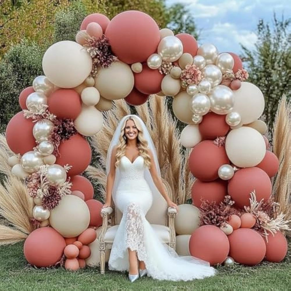 Create an elegant and full balloon arch with our Dusty Pink Balloon Garland Kit, featuring double-stuffed dusty rose pink, pearl white sand, white/cream, and nude balloons in multiple sizes. The double-layer design adds durability, ensuring the balloons hold their shape and color longer while resisting popping and deflation. This all-in-one kit includes a balloon strip, glue, ribbon, and instructions, making it easy to assemble a stunning arch for birthdays, baby showers, bridal showers, weddings, engagements, bachelorette parties, and other romantic or festive occasions. Suitable for both air and helium inflation, the balloons should be inflated no more than 85% and kept away from heat, sharp objects, and excessive friction to maintain their perfect shape.