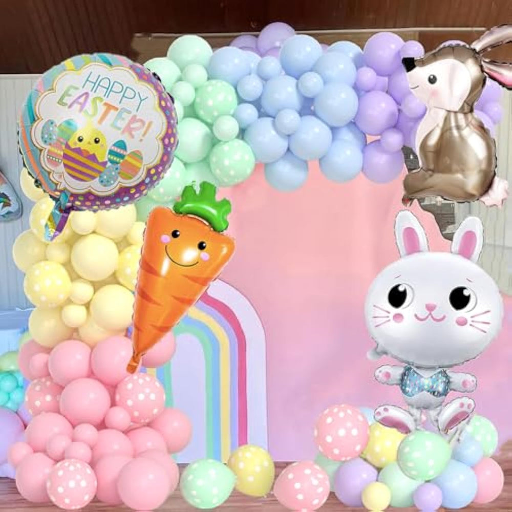 ?Valuable Pack?Easter Balloon Arch Kit Include: Pastel Blue Balloons(12Inch*12Pcs,5Inch*8Pcs), Pastel Pink Balloons( 12Inch*12Pcs,5Inch*8Pcs), Pastel Green Balloons( 12Inch*12Pcs,5Inch*8Pcs), Pastel Yellow Balloons( 12Inch*12Pcs,5Inch*8Pcs), Pastel Purple Balloons( 12Inch*12Pcs,5Inch*8Pcs) ,12Inch Polka Dot Balloons(Pastel Pink/Yellow/Green*5Pcs/Each Color),6Pcs Long Green Balloons,1Pcs Carrot Balloons,2Pcs Bunny Balloons 20X5Pcs Glues Points And 1Pcs Chain Strip. | ?Premium Material?Easter Balloons Are Made Of High-Quality And Eco-Friendly Natural Foil And Latex Balloons, Thick And Durable.These Party Balloons Can Be Filled With Air Or Helium. | ?Perfect Easter Party Decorations? The Easter Balloon Arch Kit Is Perfect For Christmas Party Decorations, Baby Shower , Children’S Party, Christmas Birthday Party, Home Decorations, Window Door Wall Porch Decorations. Easter Bunny And Carrot Foil Balloons Help You Create The Perfect Easter Balloon Garland Kit More Easily And Make Your Party More Unique And Memorable! | ?Easy To Assemble?Our Easter Party Balloon Set Includes Everything Needed To Make A Beautiful Balloon Arch Kit For Halloween Party!The Balloon Strip And Glues Included In This Kit Can Help You Make A Beautiful Easter Balloon Garland. You Can Fully Use Your Imagination And Make Balloon Decorations Of Different Shapes. | ?Satisfaction ?When You Receive These Easter Balloons Decoration, If You Are Not Satisfied With The Party Balloons Or The Balloons Are Damaged, You Can