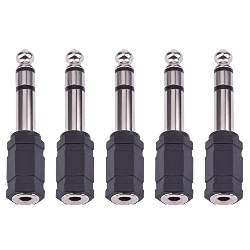 | Headphone adapter set: 6.35 mm (1/ 4 inch) audio stereo plug to 3.5 mm (1/ 8 inch) stereo headphone jack adapter, come with 5 pieces and with black color | | Wide application: earphone adapter can be applied to mixers and music applications, fit for use with guitar amps, stereo system, headphones, etc. | | Handy connection: headphone jack enables you to connect your headphones or stereo other compatible devices with most pro audio and home audio equipment | | Durable and transfer good signal: nickel plated connectors of the headphone jack plug resist corrosion and ensure minimal signal loss, for a long time use | | Easy to use: 360 degree grip tread of the stereo audio adapters allow you to plug and unplug easily and conveniently | |