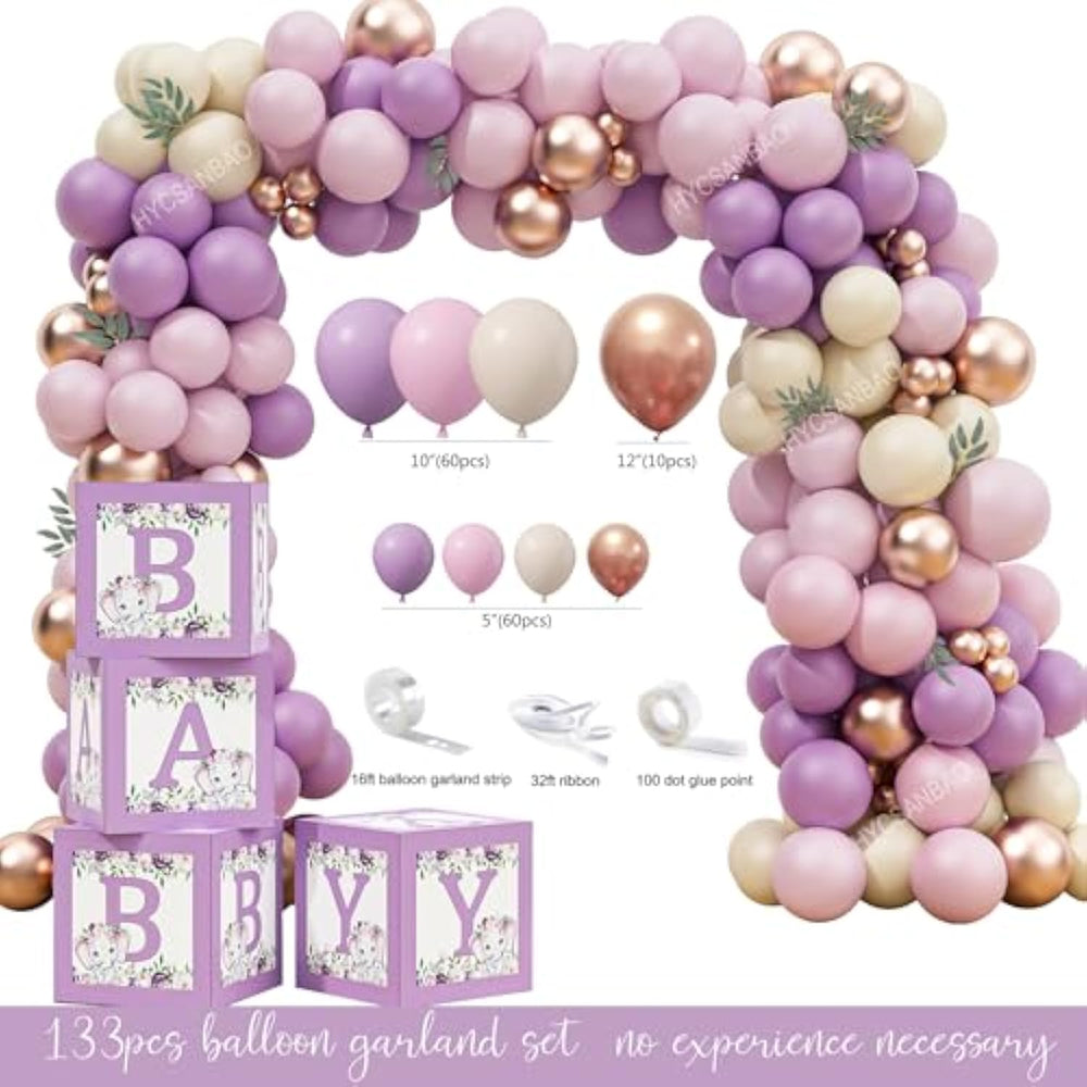| 289Pcs Purple Elephant Baby Shower Decorations - Package Includes: Elephant Baby Shower Backdrop, 4Pcs Baby Boxes, Mom To Be Sash, Dad To Be Pin, Flower Headband, Guest Book Poster, 60Pcs Round Cards, 30Pcs Elephant Baby Shower Thank You Cards, 30Pcs Elephant Baby Shower Thank You Stickers, Elephant It’S A Girl Cake Topper, 8Pcs Cupcake Toppers, Oh Baby Foil Balloons, Elephant It’S A Girl Tablecloth, Sweet Baby Girl Banner,10Pcs Leaves,133Pcs Elephant Balloon Garland Set. | | It'S A Girl Elephant Baby Shower Party Supplies - When It Comes To Baby Shower Themes, What’S Cuter Than An Elephant These Gentle Giants Symbolize Strength, Good Fortune, And Love. Our Elephant Baby Shower Decorations With Its Blend Of Tenderness And Might, Promises A Heartwarming And Memorable Celebration. | | Premium Quality Best Bang For Your Buck - Our Elephant Baby Shower Party Decorations Are Made From Premium Quality Materials. Everything You Have Ever Thought Of For Your Baby Shower Party Is Now In This Set, Eliminate The Need To Go-Shopping For Individual Elements (Otherwise Ending Up Spending More Money And Wasting More Time). Moreover, Superior Print Quality And High Attention To Details Are Sure Make Your Baby Shower Party Stand Out. | | Easy To Assemble - You Will Find It Much Easier To Make A Balloon Garland With The Tools We Provided. Tie The Inflated Balloons, Thread Balloon Knots Through The Hole Of The Strip And Glue The Smaller Balloons On; Super Easy To Create A More Richer Balloon Garland Effect, And No Experience Is Required. | | Attention - Please Use An Electric Or Hand Pump To Inflate The Balloons, Do Not Inflate The Balloon More Than 90% To Avoid Sudden Popping. Balloon Colors May Vary From Different Monitors And Screens. If It’S Super-Hot, Balloons Will Oxidize And Lose Their Shine. This Is Not A Bad Thing; It Merely Changes The Visual Texture Of The Balloon. The Balloons Will Look More “Velvety” And Acquire A Rich Matte Finish. I Do Not Recommend On Direct Sunlight Exposure! | |