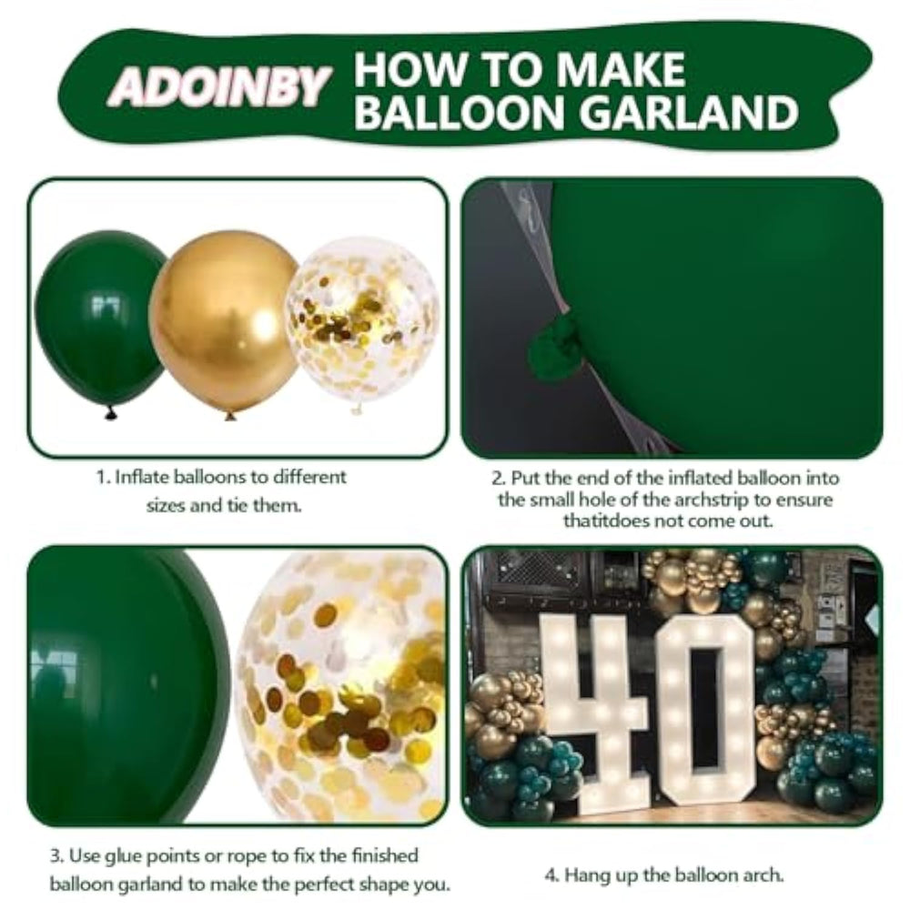 The Green and Gold Balloon Garland Arch Kit includes everything you need to create a stunning display. The set features 2 x 18-inch dark green balloons, 2 x 18-inch metallic gold balloons, 21 x 12-inch dark green balloons, 21 x 12-inch metallic gold balloons, 21 x 12-inch gold confetti balloons, 21 x 10-inch dark green balloons, 21 x 10-inch metallic gold balloons, 21 x 5-inch dark green balloons, 21 x 5-inch metallic gold balloons, a 16-foot garland strip, and 140 glue dots. Made from high-quality latex, these balloons are durable, non-toxic, and can be filled with air or helium. For best results, avoid inflating the balloons beyond 90% and keep them away from sharp objects and heat. Assembly is easy with the provided tools, simply insert the balloon knots into the garland strip holes and use the glue dots to secure the balloons in place. An electric balloon pump is recommended for quick inflation, allowing you to spend more time enjoying the celebration.