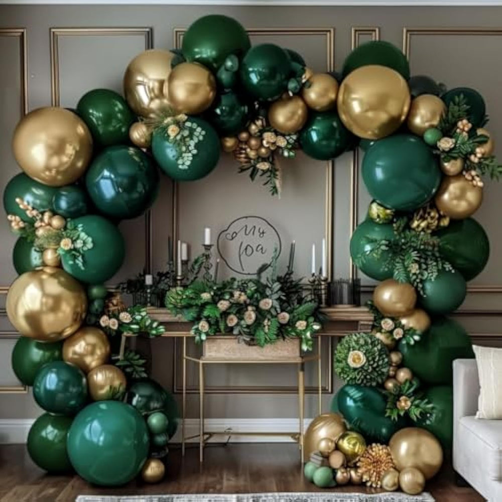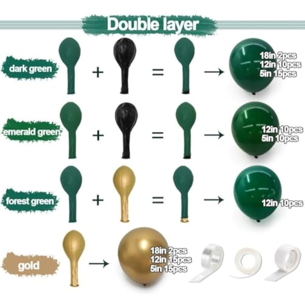Elevate your celebration with this Emerald Green & Gold Balloon Garland Kit, featuring a stunning mix of double-stuffed dark green, forest green, emerald, and metallic gold balloons in sizes ranging from 5" to 18". The 137-piece kit includes a 16 ft balloon strip, 100 glue dots, and a 33 ft white ribbon—everything you need to create a lush, elegant balloon arch. Made from high-quality latex, the balloons are durable, non-toxic, and hold air for up to 72 hours. Perfect for birthdays, weddings, baby showers, graduations, and jungle or forest-themed parties, this kit adds a rich, stylish touch to any special occasion. For a fuller arch, two kits are recommended.