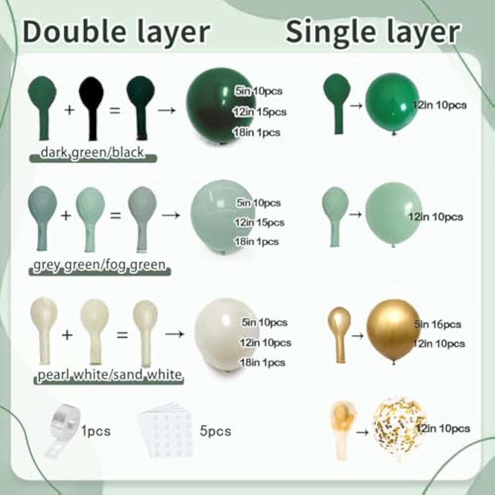 | ?Dark Green Balloons?: Dark Green Balloon Arch Kit Includes: 73Pcs Double Stuffed Green Balloons, Pearl Sand White Balloons, Dusty Green Balloons. 56Pcs 12" Single Balloons Include: Dark Green Balloons, Fog Green Balloons, Metallic Gold Balloons And Gold Confetti Balloons, 1 Roll Of Decorative Strip And 5Pcs Balloon Sticker. | | ?High-Quality Materials?: This Emerald Green Gold Balloons Are Made Of High-Quality Latex, Which Is Thicker Than Other Balloons, Not Easy To Burst And Safe For Children. These Double Stufffed Forest Green And Gold Balloons Can Be Filled With Air And Helium. The Hunter Green Balloons Are Able To Stay Inflated For A Long Time | | ?Easy To Assemble?: We Recommend That You Use An Electric Air Pump To Inflate The Double-Filled Dark Green Gold White Balloons (The Inflation Volume Should Not Exceed 85%) To Save Your Precious Time. The Balloon Tape And Balloon Glue Dots Included In The Package Will Help You Quickly Make A Gorgeous Wreath Green Gold White Balloon Arch. Enjoy The Fun Of Diy | | ?Widely Applications?: Double Stuffed Dark Green Balloon Garland Is Are Designed For Specific Occasions Like Weddings, Birthdays, Baby Shower, Graduation, Engagement, Wild One, Jungle Safari Theme,St. Patricks Day Party. The Emerald Green Gold Balloon Garland Will Add Atmosphere And Charm To Your Parties And Events | | ?Please Note?: Please Avoid Exposing The Hunter Green Gold Balloon Arch To High Temperature, Sharp Objects Or Excessive Friction To Prevent Bursting. It Is Normal For Balloon To Oxidize After Being Inflated For A Period Of Time, Please Don'T Worry | |