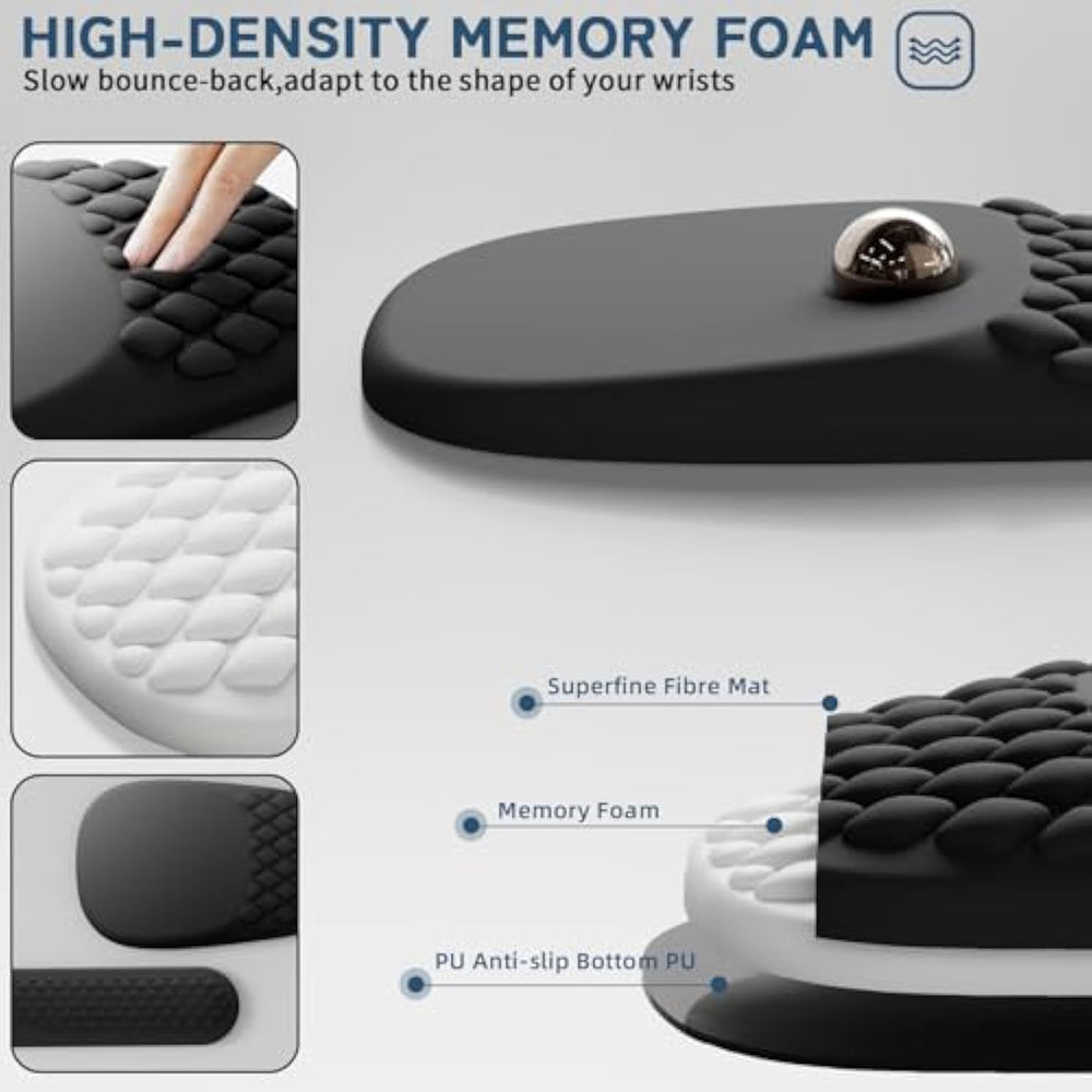 | ?3-In-1 Ergonomic Design? Ergonomic Mouse Pad Features A Special 8-Degree Slope And Massage Protrusion Design, Which Can Prevent Wrist Or Hand Injuries, Reduce Pressure, Prevent Carpal Tunnel Pain, Promote Blood Flow To The Wrist, Improve Carpal Tunnel Syndrome (Cts), And Keep Your Wrist In The Most Comfortable State. | | ?High-Quality Fabric?The Mouse Pad Is Made Of High-Quality Silky Lycra Fabric And Comfortable And Soft High Elasticity Slow Rebound Memory Foam, Which Is Not Easily Deformed After Long-Term Use. The Smooth Surface Not Only Provides A Soothing And Relaxing Feeling For Your Skin, But Also The Edges Of The Mouse Pad Will Not Curl Or Crack After Prolonged Use. | | ?Non-Slip Pu Base?Mouse Pad With Wrist Rest And Keyboard Pad Are Made Of Pu Material, Which Provides Higher Stability Than The Rubber Base And Can Effectively Prevent The Mouse Pad From Sliding Or Unnecessary Movement. | | ?Widely Used?Mouse Pad:11X 7.9 X 1.1Inch(29X20X2.8Cm),Keyboard Wrist Rest : 17.3X3X0.6Inch(44X7.5X1.5Cm) , Cup Coaster:4Inch(10.2Cm)