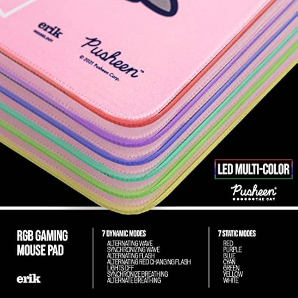 | ??Plug And Play: Your Set Up Will Be Full Of Colours With Pusheen The Cat. Use It In Your Office Or At Home. If You Are A Gamer, A Graphic Designer Or You Just Want To Decorate Your Set Up In Style. Surprise Your Friends With This Fantastic Pusheen Gift | | ??Bigger, Better: This Xl Gaming Mat Has Been Designed To Enhance Your Gaming Experience With Plenty Room For Your Mouse And Keyboard. The Rgb Gaming Mouse Mat Includes 14 Lighting Modes To Match With Your Rgb Gaming Mouse And Keyboard. With Measurements Of 35.4 X 15.75 Inch And A 0.16 Inch Thick Base You Will Improve In Accuracy, Speed And Last But Not Least, Comfort. Ideal Pink Gaming Accessory For Your Desk | | ??Specs: The Surface, Made Of High Density Waterproof Coating Fabric, Has Been Designed Specially For You, To Support Long Gaming Hours And Allow You To Have A Drink While You Play Your Favourite Games. It Also Has An Anti-Slip Base, Ensuring It Grips Firmly To Your Desk. It Also Includes 1X Usb Cable | | ??Led Mouse Mat: 14 Lighting Modes To Customize Your Set Up As You Like! It Includes 7 Static Light Modes - Red, Blue, Green, Purple, Cyan, Yellow And White, Alternating Wave, Synchronizing Wave, Alternating Flash, Alternating Red Changing Flash, Lights Off, Synchronize Breathing And Alternate Breathing. Press And Hold For 3 Seconds To Switch The Leds Off And Memorize Your Last Settings! | | ??100% Official License: Erik´S 2022 Rgb Gaming Mouse Mat Range Has Been Designed For Its Most Demanding