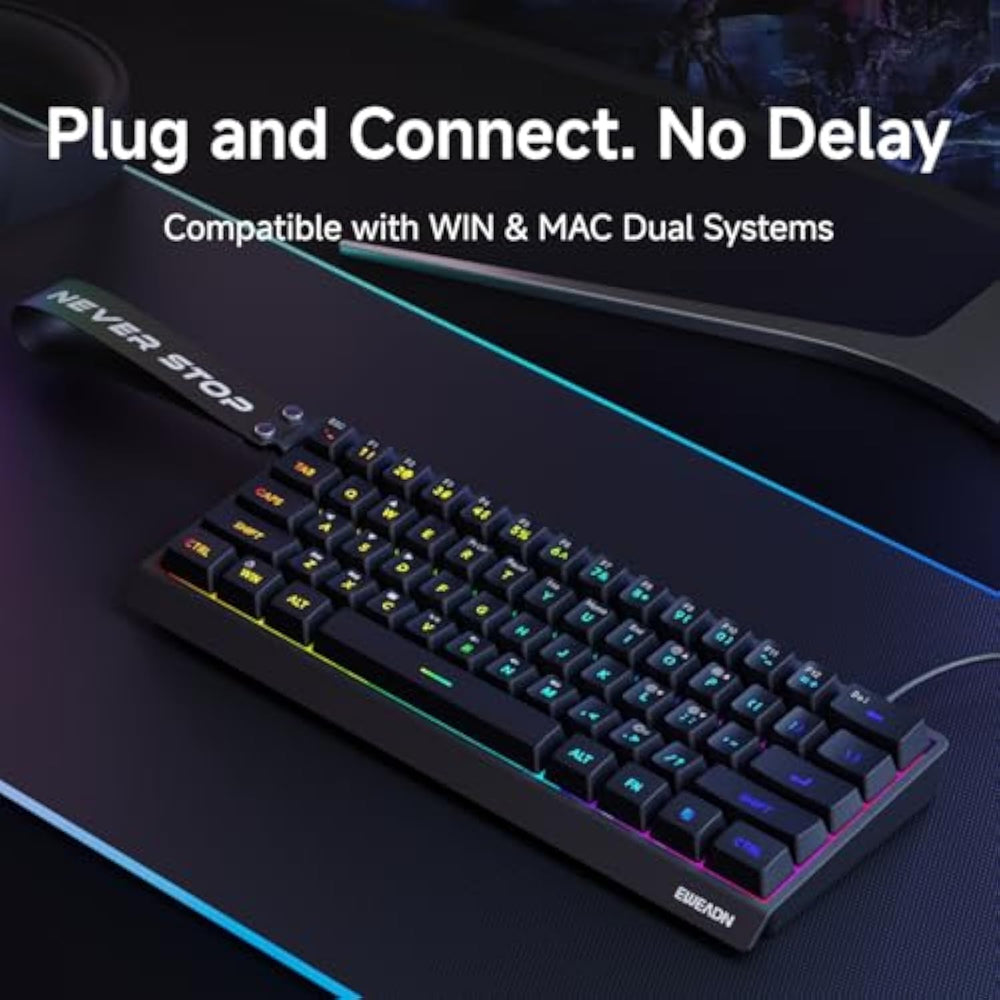 | Classic Compact 60% Design: The Eweadn F61'S Space-Saving 60% Layout Packs Everything You Need Into A 60% Gaming Keyboard Wired. It'S Perfect For Gaming, Office Work, Or Travel, Clearing Up Your Desk Space Without Losing The Keys You Use Most. Fit For Gamers And Everyday Typists Alike | | Wired Connection, Plug And Play: The Silent Gaming Keyboard Connects Via A Detachable Type-C Cable, Providing Stable, Continuous And Ultra-Low Input Delay. It Has A Lockable Win Key With Fn+Win To Prevent Accidental Touches. Plug And Play, And Is Compatible With Both Windows And Mac Dual Systems | | Cool Rgb Lighting Effects Dual-Layer Injection Keycaps : This 60% Rgb Keyboard Includes 6 Backlight Effects And 5 Light Brightness Levels. You Can Adjust The Light Brightness And Breathing Light Speed Of Your Wired Gaming Keyboard According To Your Needs. The F61 Wired Keyboard Uses Dual-Layer Injection Keycaps, And The Characters Are Bright And Translucent, Clearly Display The Characters In Dark Environments. No More Squinting Or Worrying About Faded Letters! | | Ergonomic Design And Mechanical Feel: This 60% Mini Keyboard Features An Ergonomic Design That Fits Perfectly To Your Fingertips, Ensuring Comfortable Extended Use. Advanced Mechanical-Like Technology Provides A Satisfying Typing Feel While Maintaining The Quietness Of A Membrane Keyboard. Its Compact Size And Powerful Feel Make Gaming Easier | | Wide Compatibility Easy To Carry: The Black Membrane Gaming Keyboard Supports Win Mac Dual Systems And Supports Connecting Your C-Port Devices - Laptops, Mobile Phones, Tablets, Pcs, Etc. The 60% Layout Design Makes It Very Easy To Carry And Put In A Bag, And It Is Simple And Does Not Take Up Space When Placed On The Desktop | |