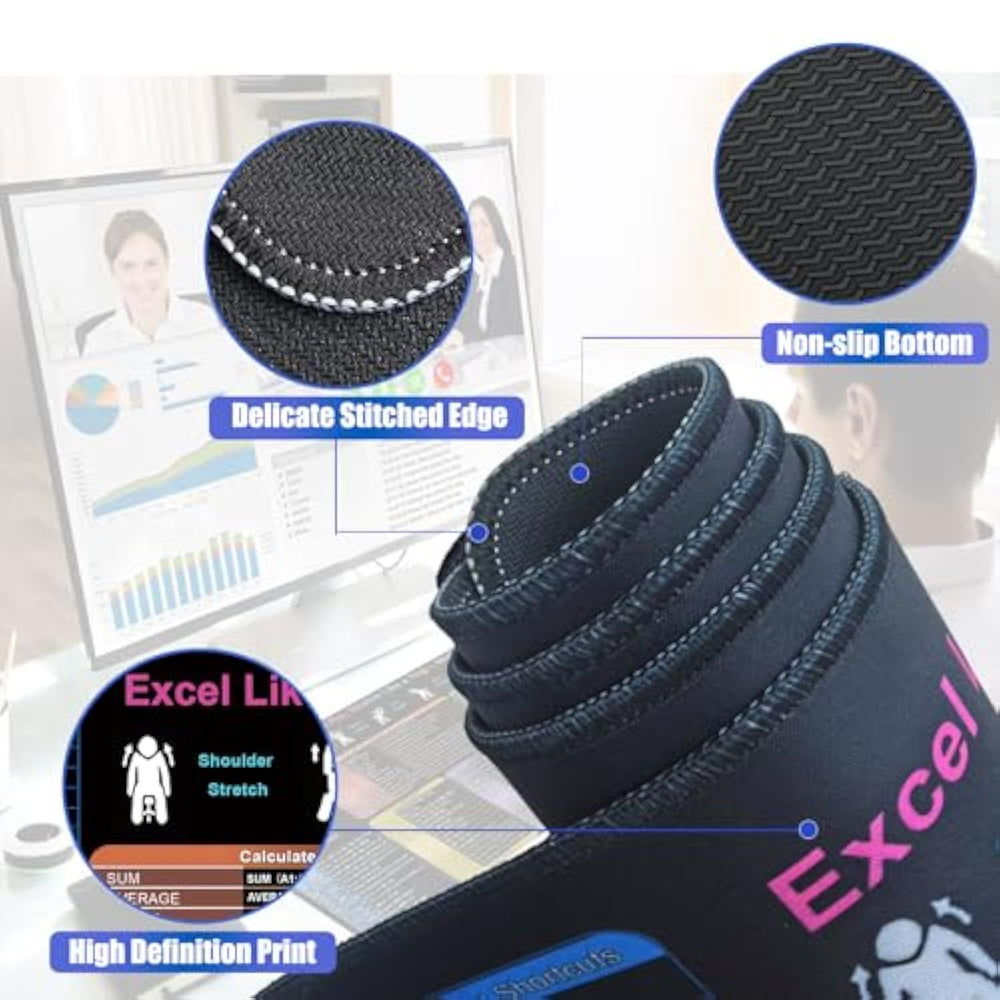| Extended Large Size: The Excel Cheat Sheet Desk Pad Boasts An Xl Size Of 31.5"×11.8" (800×300Mm). It Offers Ample Space To Move Your Mouse Freely, While Protecting Your Desk From Scratches, Stains, And Wear | | Categorized Excel Skills: This Excel Shortcuts Mousepad Compiles Over 150 Shortcuts And Formulas Across 10 Modules. Covering Everything From Basic Operations Like Data Entry To Complex Functions And Analysis, It Helps You Master Intricate Tasks And Boost Productivity | | Non-Slip Stable: The Bottom Of This Excel Mouse Pad Is Crafted From 3Mm-Thick Non-Slip Rubber. This Material Ensures The Mouse Pad Stays Firmly In Place During Use, Whether You'Re Working On Important Tasks Or Immersed In An Intense Gaming Session, Providing A Stable Operating Environment | | Smooth Mouse Movement: The Excel Cheat Sheet Desk Mat Features A Premium, Ultra-Soft Fabric Surface, Ensuring A Buttery-Smooth And Precision Tracking Mouse Movement | | Waterproof Easy To Clean: Thanks To Its Waterproof Surface, Accidental Spills Of Drinks Or Coffee On This Excel Pad Shortcut Mat Can Be Easily Wiped Away With A Paper Towel Or Damp Cloth. Keep Your Workspace Tidy And The Mouse Pad Looking Brand New With Minimal Effort | | Clear Vibrant Printing: This Excel Shortcut Mat Employs State-Of-The-Art Hd Printing Technology To Present Detailed And Vivid Visuals. The Advanced Printing Process Not Only Showcases Every Excel Formula And Shortcut With Crystal Clarity But Also Ensures Long-Lasting, Anti-Fade Durability, Maintaining Its Vibrant Look Even After Extended Use | | Relaxation And Stretching Exercises: This Excel Desk Mat Features Vivid Illustrations Of Office-Friendly Stretching And Relaxation Exercises. These Visual Guides Are Designed To Prompt You To Take Short, Rejuvenating Breaks During Those Long, Busy Work Or Study Sessions, Helping You Relieve Stress And Maintain Good Physical Well-Being | | Multiple Usage Scenarios: The Excel Mouse Pad Shortcuts Is Perfect For Various Settings, Including Offices And Study Areas. It Helps Office Workers Boost Productivity And Enables Students To Quickly Master Excel Skills. With Its Visually Appealing Design, It Seamlessly Fits Into Different Environments. Whether For Personal Use Or As A Gift, It'S An Ideal Choice For Excel Enthusiasts | |