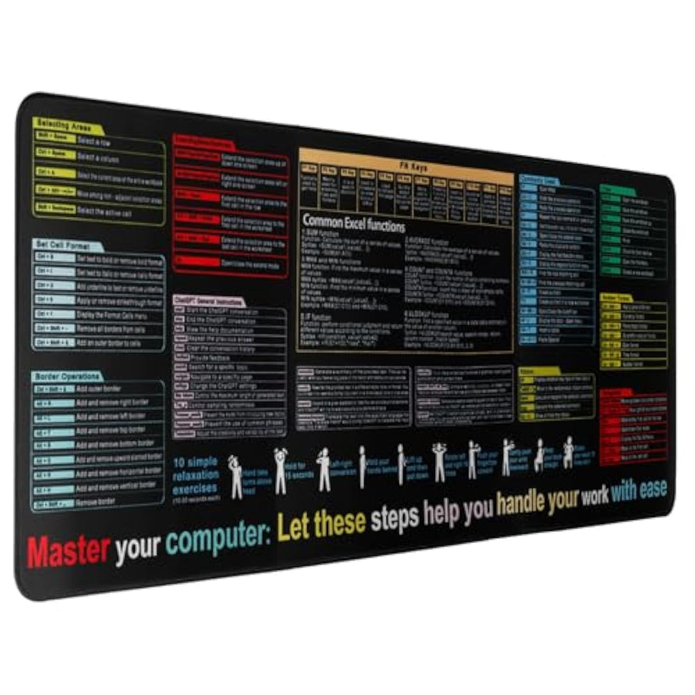 | High Materials: The Surface Of This Large Mouse Pad Adopts Anti Overflow Technology, So You No Longer Have To Worry About Liquid Overflow, Effectively Waterproof. As The Surface Of The Gaming Mouse Pad, It Allows You To Enjoy Excellent Mouse Control, Ensuring Smoothness And Precision. The High-Quality Natural Rubber Base Firmly Grips Most Surfaces, Preventing The Mat From Sliding And Providing A Stable And Reliable Workspace. | | Large Size: This Desktop Mouse Pad Comes In Size: 31.5" X 11.8". Provides Ample Space For Keyboard And Mouse, Enhancing Your Comfort Level And Making It Perfect For Work, Study, And Gaming. | | High Quality Printing: This Desktop Mouse Pad Uses Fade Resistant Ink For Digital Printing. The Pad Has Clear And Sharp Graphics And Bright Colors, And Even After Frequent Cleaning, It Can Maintain Its Bright Colors And Sharp Details, Ensuring Long-Term Use. | | Improve Your Work Efficiency: This Perfect Mouse Desktop Pad Includes Excel Shortcuts And Formulas, Which Can Effectively Improve Your Efficiency In Excel Related Tasks. Execute Tasks Quickly, Accurately, And Efficiently, Saving Time And Energy. | | Ideal Gift Choice: This Thoughtful Desktop Mouse Pad Is Perfect For Giving To Colleagues Or Friends. Whether It'S Studying, Working, Or Entertaining, This Desktop Mouse Pad Is Your Top Choice! | |