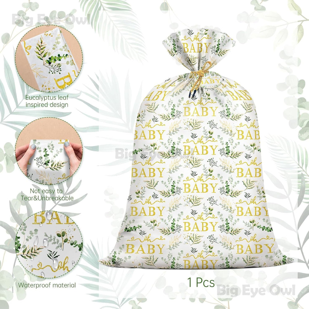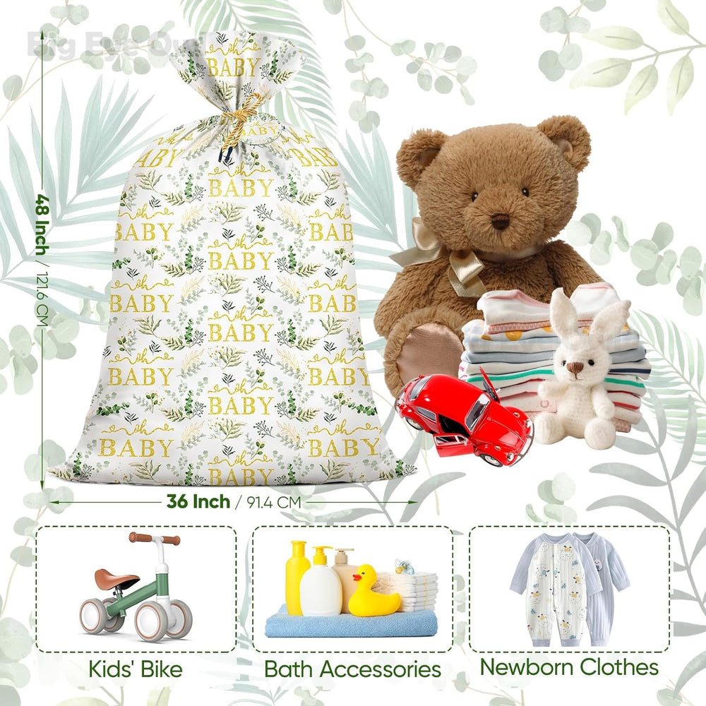 | [Large Size] This Baby Shower Gift Bag Measures 36 X 48 Inches And Is Large Enough To Hold A Variety Of Big Baby Items Such As Stuffed Animals, Clothing, Diapers, And More. It Comes Equipped With Ties. No Matter What Large Gift You Need To Give, This Bag Fits Perfectly, Offering Both Practicality And Elegance. [Safe And High Quality] Made From High-Quality Pe Plastic, This Jumbo Gift Bag Is Durable And Waterproof. It’S Strong Enough To Hold Heavy, Oversized Gifts Without Breaking. Plus, It'S Reusable, Making It An Eco-Friendly Choice. [Delicate Design] The Baby Gift Bag Features Charming Eucalyptus Leaf Patterns And An Elegant "Oh Baby" Design. The Sage Green Color Gives A Relaxed And Soothing Feel. This 36 X 48 Inch Oversized Gift Bag Is The Perfect Choice For Your Baby Shower Party. [Perfect For Every Occasion] This Gift Bag Is Ideal For A Variety Of Events Including Christmas, Thanksgiving, Halloween, Baby Showers, Birthday Parties, Children’S Birthday Parties, Gender Reveal Parties, And Other Special Occasions. It Also Serves Well As A Large Storage Bag For Daily Use. Whether For Infants Or Adults, It Brings Surprises And Joy. [Wide Applications] This Xl Baby Shower Gift Bag With Rope Handles Is Perfect For Carrying A Variety Of Items. It Can Be Used As A Gift Bag, Wrapping Bag, Storage Bag, And More. It'S Practical And Convenient, Suitable For Small Gifts, Snacks, Large Toys, Big Dolls, Or Daily Storage Of Miscellaneous Items. It'S Especially Perfect For Giant Or Clumsily Shaped Gifts That Are Difficult To Wrap With Traditional Wrapping Paper.
