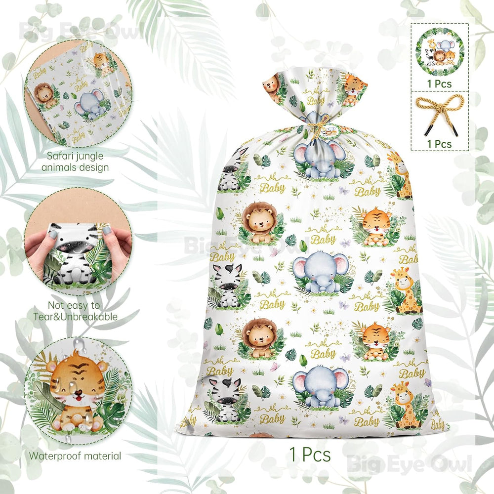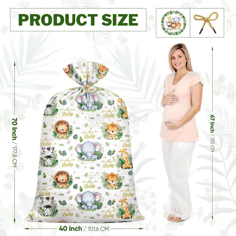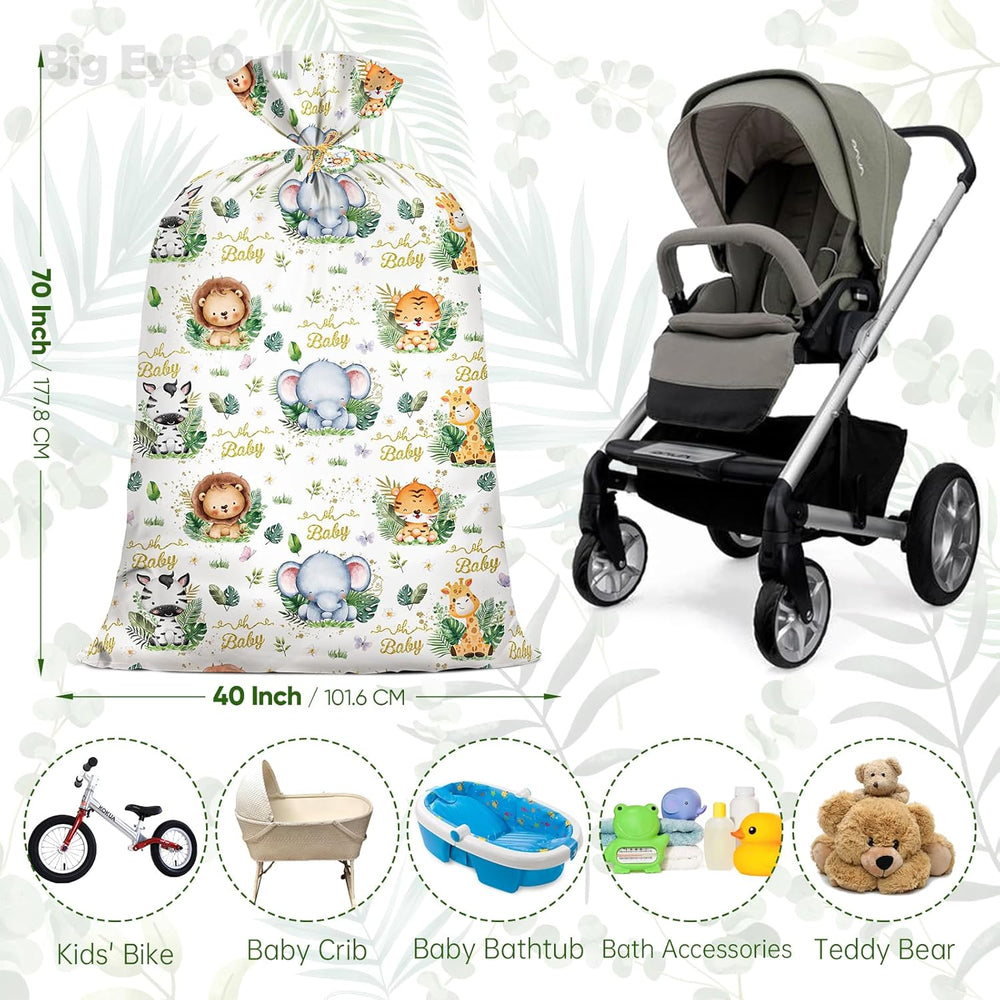 | [Large Size]Oversized Baby Shower Plastic Gift Bags Includes 1 Pcs Large Gift Bag, 1 Pcs Gift Tag And 1 Pcs Red String.70"X 40" Size Is Spacious Enough, Perfect For Wrapping Oversized, Huge Or Clumsily Shaped Odd Shaped Baby Big Gifts.You Can Cut Off The Excess Parts And Cut Them To Any Size You Want! [Reusable Baby Gift Bags]The Xl Size Baby Gift Bag Is Made Of Pe, Which Is A Strong Material, Durable And Reusable. In Addition, It Is Waterproof And You Can Clean The Bag By Simply Wiping It With A Cloth. Importantly, The Bag Is Opaque To Ensure A Sense Of Mystery When Giving Gifts. It'S Great For Wrapping Your Huge Gifts! [Convenient Gift Tags Ropes]The Extra Large Size Baby Shower Plastic Gift Bag Thoughtfully Comes With A Gift Tag And String. The Tag Allows You To Write Down The Recipient'S Name Easily, And The String Tie Makes The Package More Beautifully Simple And Clutter-Free. [Safari Jungle Animals Theme ] The Gift Bag Showcases Tropical Jungle Animal Designs And Palm Leaf Patterns, Featuring Elephants, Giraffes, Lions, And Tigers. This Creates A Vibrant Adventure Theme That Offers A Fresh And Exciting Visual Experience.This Gift Bag Is Not Only Suitable For Baby Party, But Also Can Be Used For Birthday Party, Safari Theme Party,Children'S Birthday Party, Baby Shower And Other Occasions That Need To Wrap Gifts. [Wide Applications] This Baby Shower Gift Bags With Drawstring Are Perfect For Carrying A Variety Of Items And Can Be Used For Goodie Bags, Wrapping Bags, Storage Bags And More. They Are Not Only Practical And Convenient, Whether It Is Loaded With Huge Gifts Or Daily Storage Of Miscellaneous Items, Can Be Handy, And Both Fashionable And Beautiful Features.
