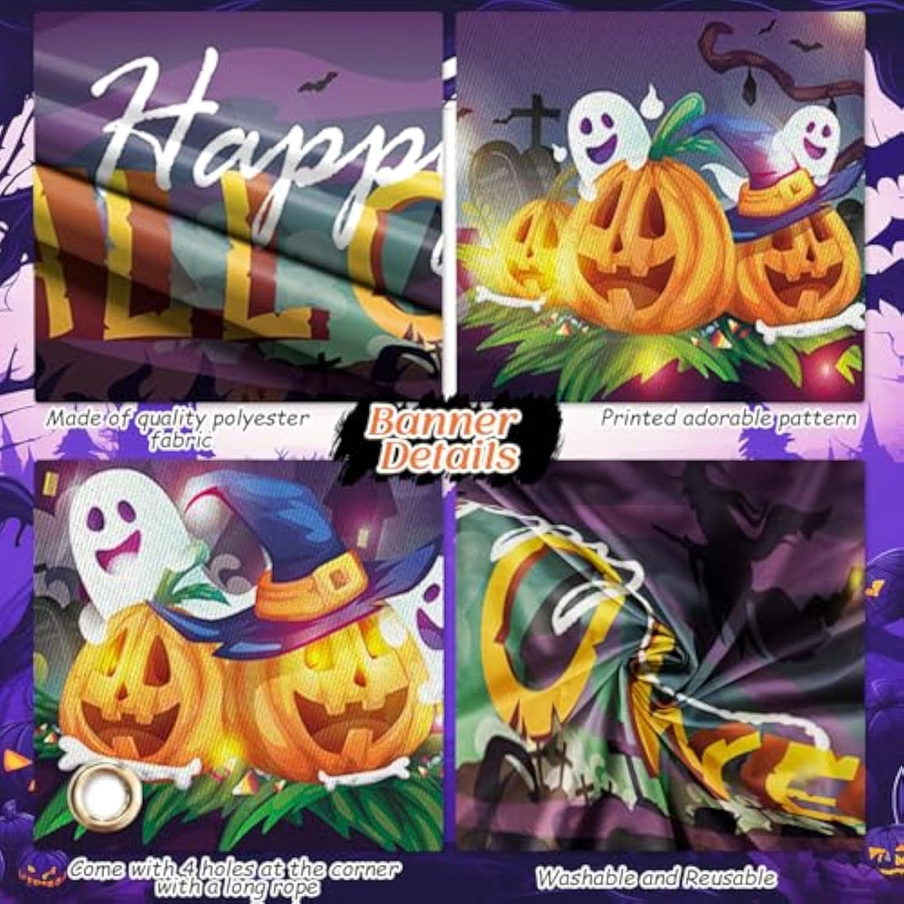 This XXL Halloween banner backdrop measures 118 x 19.6 inches and comes with copper grommets at each corner and a 1.6m rope for easy hanging. Featuring vibrant and unique designs with pumpkins, ghosts, witches on brooms, bats, castles, and a dark night sky, it adds a mysterious and dynamic vibe to any Halloween celebration. Made from high-quality polyester fabric, the banner is lightweight, foldable for storage, durable for outdoor use, and maintains vivid colors, with creases easily removed using a steam or electric iron. Pre-equipped with four corner holes and eight metal buckles, it can be hung indoors or outdoors on walls, ceilings, windows, doors, fences, trees, arches, or used as a festive photo backdrop.
