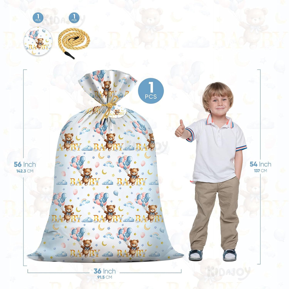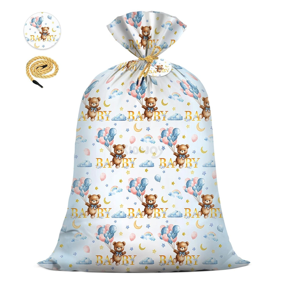 | ?What Will You Get?1Pcs 56"X 36" Premium Giant Bag?1Pcs Gift Tag?1Pcs Tie String. ?Premium Quality Material?These Xl Plastic Teddy Bear Gift Bags Are Made From Premium High-Toughness Pe, Offering Thick And Durable Protection For Heavy Items. The Non-Transparent Design Ensures Keeps Your Gifts Mysterious. ?Eco-Friendly Reusable?This Giant Teddy Bear Gift Bag Is Not Only Convenient But Also Reusable, Making It An Eco-Friendly Choice. Its Durability Allows For Multiple Uses, Helping To Reduce Waste While Offering A Practical Solution For Future Gift-Giving Needs. ?Extra Large Gift Bag? Our Giant Large Gift Bag Is Perfect For Accommodating Large Or Oddly Shaped Items Like Bear-Themed Bedding, Bear Toys, Costumes, Large Stuffed Bear, And Even Children'S Bikes. It Also Saves You Time On Wrapping. With This Bag, You’Ll Never Worry About How To Wrap Big Gifts Again—Just One Bag, Quick And Convenient. ?Unique Cute Bear Design?The Cute Little Bear Is Holding Colorful Balloons, Floating Through A Dreamy Backdrop Of Stars, Moons, And Rainbows — A Perfect Mix Of Innocence And Fantasy. The Golden "Baby" Text Shines With A Warm Glow, Sending All The Best Wishes For The Newborn. Whether Used As A Gift Bag Or As A Decoration, It’S Full Of Love And Warmth, Making It The Perfect Touch For Any Baby Celebration.