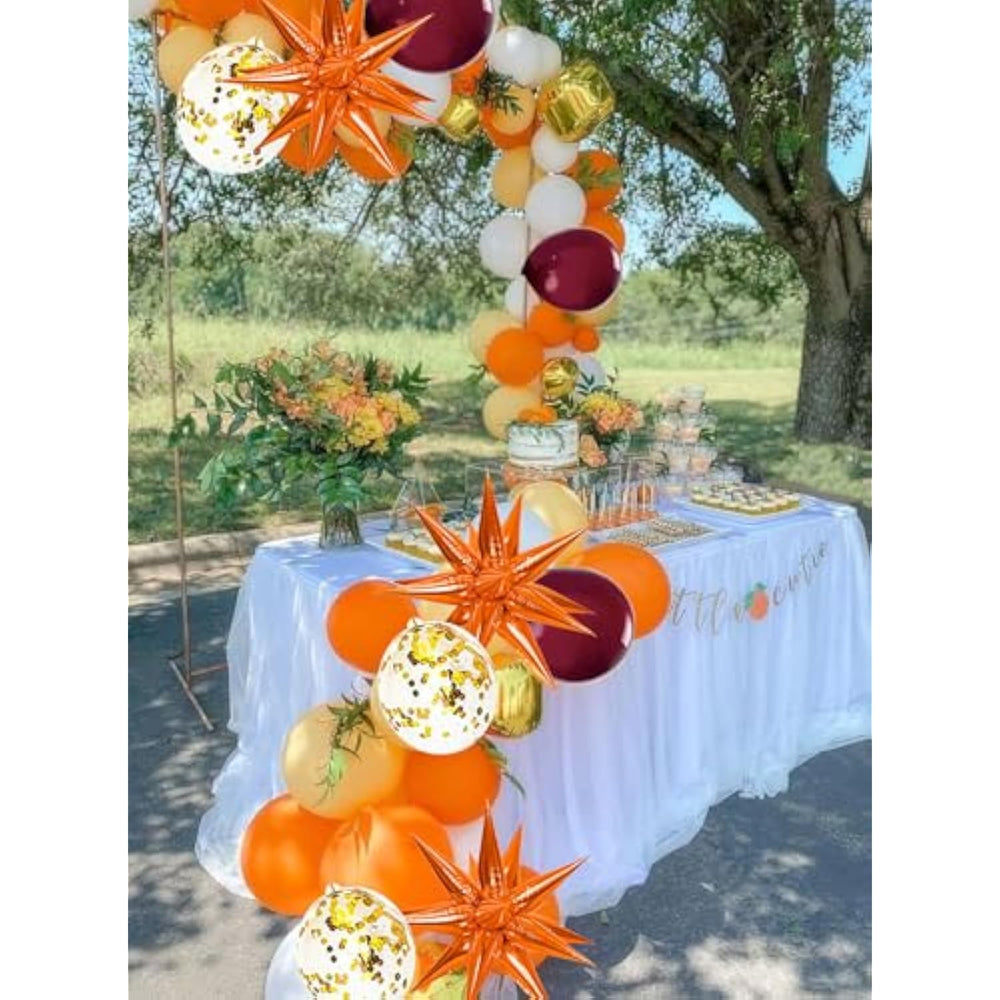 This fall balloon set features 12" latex balloons in burgundy, orange, gold, and gold confetti, including 40 balloons (10 of each color), plus 3 one-piece 27" orange star balloons, a balloon strip, and glue dots for easy assembly. The warm, cozy colors create a festive autumn atmosphere, perfect for Thanksgiving, fall birthdays, baby showers, bridal showers, graduation celebrations, outdoor picnics, room decor, or photography props. The one-piece star balloons are simple to inflate, making setup quick, hassle-free, and time-saving.