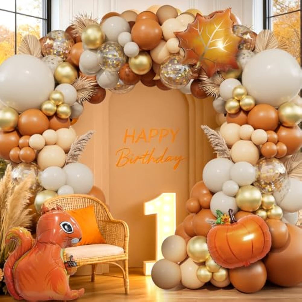 This orange balloon arch kit includes a variety of balloons: 18” white sand and burnt orange (2 pcs), 12” metallic gold, burnt orange, and white sand (15 pcs), 10” metallic gold, burnt orange, white sand, and nude (65 pcs), 5” metallic gold, white sand, nude, and burnt orange (65 pcs), plus 7 balloon tools including an arch strip, glue dots, and ribbon. Made from high-quality latex, the balloons are flexible, durable, and easy to inflate, suitable for kids and adults alike. Ideal for baby showers, fall birthdays, little pumpkin parties, and Thanksgiving celebrations, the kit adds a charming, festive touch and serves as a perfect backdrop for photos. Assembly is simple with included tools, allowing you to create a stunning balloon garland with mixed sizes and colors using helium or air, arch strips, ribbons, and glue dots for endless styling possibilities.