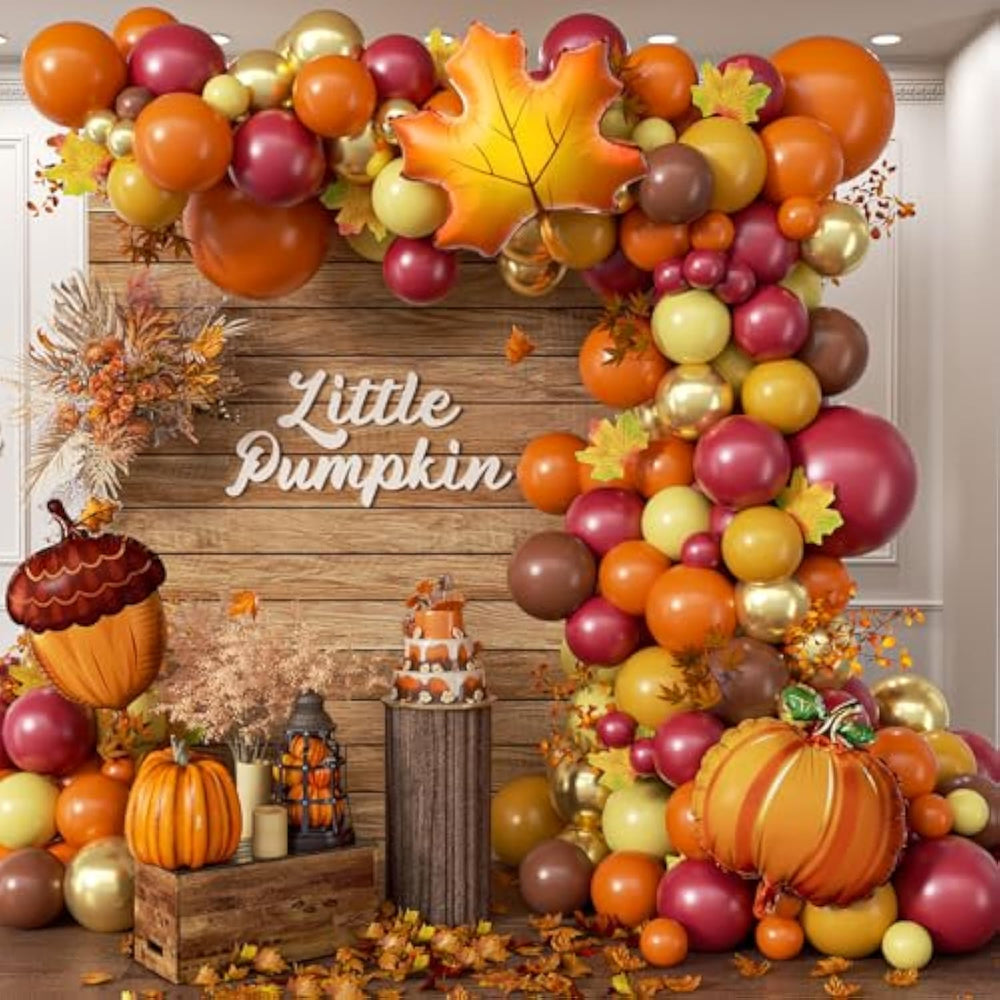 The fall balloon arch kit includes 41 burnt orange balloons, 30 burgundy balloons, 31 mustard yellow balloons, 15 dark green balloons, 10 brown balloons, 10 metallic gold balloons, four foil balloons, an orange ribbon, a decorative strip, and 100 glue dots. Made from high-quality materials, the balloons are easy to inflate and hold their shape when not overinflated. Simply create clusters with a hand pump, attach them to the background, and use smaller balloons to fill gaps for a fuller look. Ideal for fall parties, baby showers, birthdays, Thanksgiving celebrations, and other autumn-themed events.