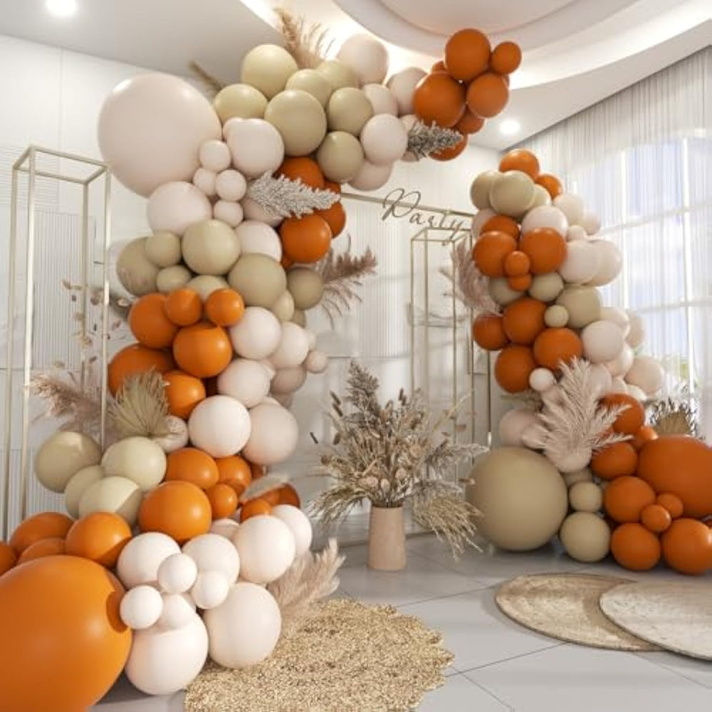 This 160-piece boho balloon garland arch kit includes pastel orange, pale brown, and burnt orange balloons in assorted sizes (18", 12", 10", 5"), along with a balloon strip, glue dots, ribbon, and additional white balloons for variety. Made of natural latex, the balloons are durable, non-toxic, and long-lasting for up to several days. Easy to assemble with the provided accessories, the kit allows for fun DIY setup with air or helium. Perfect for birthdays, weddings, baby showers, gender reveals, bridal showers, Thanksgiving, and boho-themed celebrations, it creates a warm and stylish atmosphere for any event.
