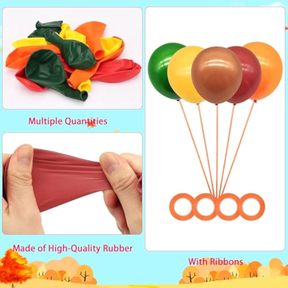 This fall party balloon set includes 20 balloons each in yellow, green, brown, orange, and red, along with 4 rolls of orange ribbon, perfect for autumn and Thanksgiving decorations. Made from durable, high-quality natural latex, the balloons are bright, sturdy, and resistant to bursting. Each balloon measures approximately 12 inches, providing a noticeable and festive touch to any celebration. Ideal for decorating rooms, ceilings, windows, gardens, doors, or party spaces, these colorful balloons create a joyful autumn atmosphere and make great photo backdrops for memorable moments.