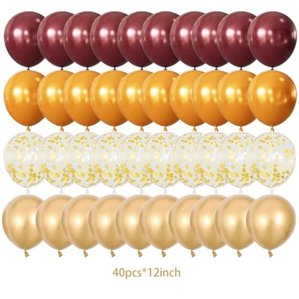 Set of 40 premium 12-inch latex balloons in maroon, orange, and metallic gold, including confetti balloons, ribbon, and a 9.8ft fall leaf garland, perfect for fall-themed celebrations like Thanksgiving, autumn birthdays, bridal showers, and seasonal parties, adding a festive and elegant autumn touch to any event space.