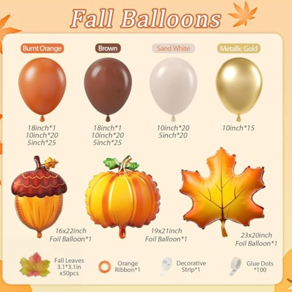 This fall balloon arch kit includes 46 burnt orange balloons, 46 brown balloons, 40 sand white balloons, 15 metallic gold balloons, 3 foil balloons, 50 small fall leaf balloons, an orange ribbon, a decorative strip, and 100 glue dots. Made from high-quality materials, the balloons are easy to inflate and maintain their shape. The kit comes with all accessories needed to assemble a stunning garland: inflate the balloons, attach them with the ribbon or strip, form clusters, and use glue dots to add small balloons for decoration. Perfect for fall parties, baby showers, little pumpkin-themed events, birthdays, and Thanksgiving celebrations.