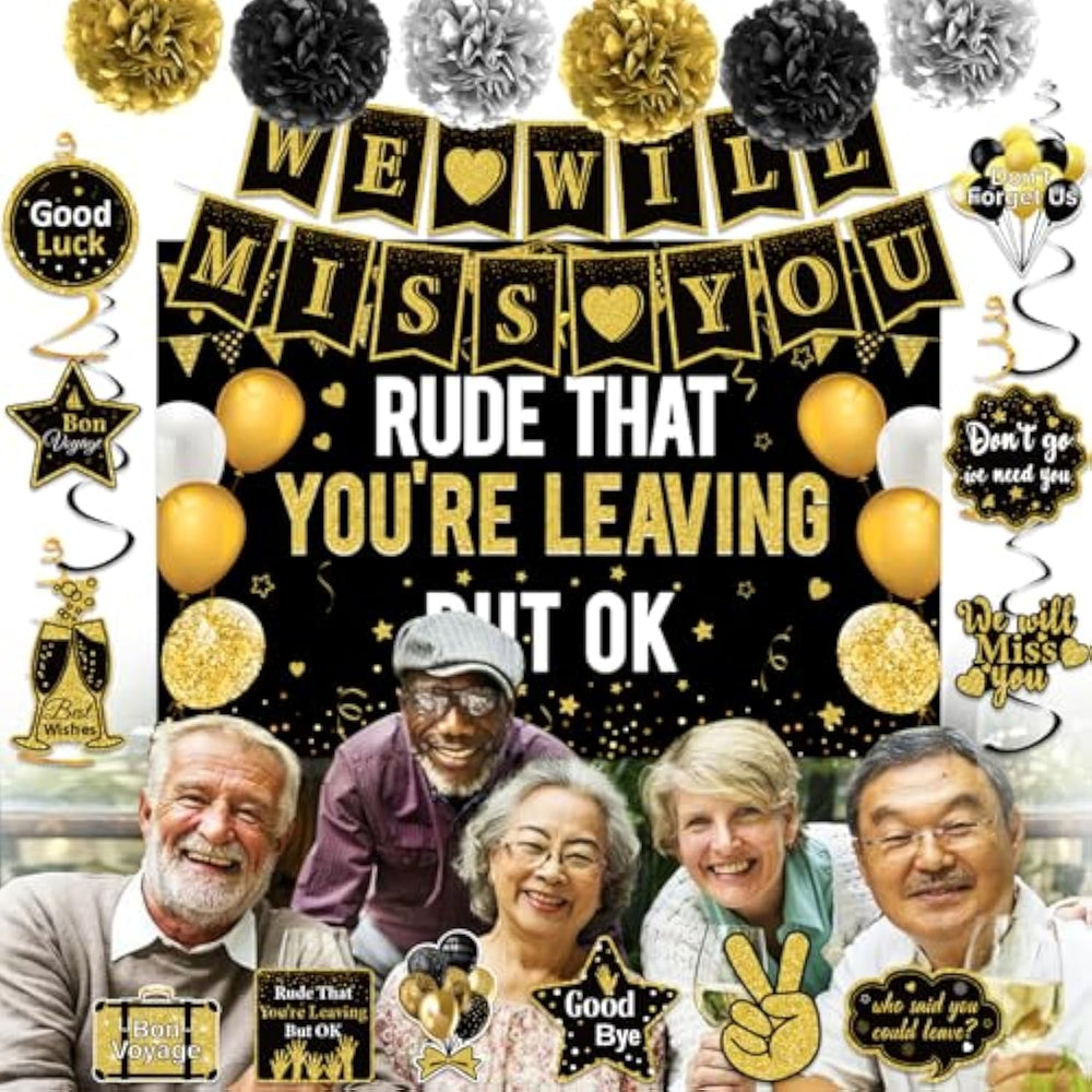 Send them off in style with this 41-piece “We Will Miss You” Farewell Party Decoration Kit, perfect for retirement, job changes, or going-away parties. Featuring a bold black and gold theme, the set includes a “WE WILL MISS YOU” banner, a “RUDE THAT YOU’RE LEAVING BUT OK” backdrop, 6 hanging swirls, 6 farewell-themed cards, and 6 tissue paper pompoms. Made with durable, fade-resistant materials and easy-to-hang designs, this set adds humor, sentiment, and style to any farewell celebration for coworkers, friends, or loved ones.