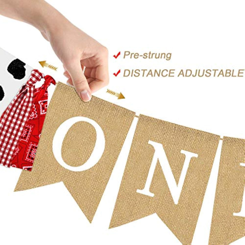 | Burlap | | Material: Natural Jute Burlap And Cloth Fabric. Durable And Reusable. | | String Length Is About 2 Meters(6.56Ft). Single Flag Size: 13*18Cm (5.1*7.1Inch). | | Pre-Strung. Do Not Need Diy. Flags Can Be Adjusted As Whatever You Would Like. | | Great For Cow Theme Boy Girl 1St Birthday Party High Chair Decoration. And Also Can Be Used As Photo Booth Backdrop. | | Jute Burlap Material Can Creat A Rustic, Natural Feel To Your Party Decor. | |