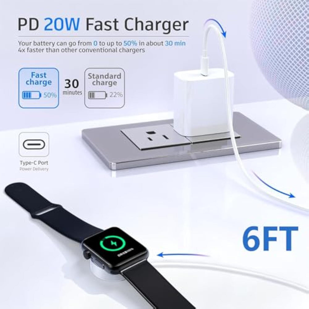 | Compatible With Apple Watch Series:The For Apple Fast Watch Charger Cable Is Compatible With Apple Watch Series 10, Series 9, Series 8, Series7, Series Se, Series 6, Series 5, Series 4, Series 3, Series 2, Series 1, And Compatible With Apple Watch Ultra, For Apple Watch Sports, For Apple Watch Herm~S And For Apple Watch Edition. It Can Support All Watch Sizes, Including All 38Mm, 40Mm, 41Mm, 42Mm, 44Mm And 45Mm Versions | | 20W Usb C Fast Charger Block: Our For Apple Watch Charger Comes With 20W Usb C Charger Adapter, Up To 3X Faster Than The 5W Original Charger Speed. To Get Better Experience, For Apple Watch Charger Series 10 Is Fully Charged In About 2.5 Hours | | 6.6Ft/2M Strong Magnetic Adsorption Cable?Compatible With Apple Watch Charger With Strong Adsorption, You Can Freely Adjust The Angle Of The Watch While Charging.To Avoid Overheating,We Recommend Charging Your Watch Without A Case.Watch Charger Cable Pass Bend Testing And Plugging Testing.Can Providing Superirability And Secure And Stable Charging | | Safe Watch Charger: Our Iwatch Charger With The Original Mfi Chip And Integrated Magnetic Technology,Ensures Fast Charging Speed For Apple Devices.This For Apple Watch Charger Cable Is Made Of High Quality Abs+Pc And Pure Copper Wire, The Cable Has Been Tested For 10000+ Times Of Bending To Avoid Shortened Lifespan Due To Aging And Usage | | What You Will Get : Our Package Includes 2X 20W For Apple Watch Charger Usb C/Type C Fast Charger Block And 2X 6.6Ft For Apple Watch Charger Cable. If You Have Any Question About The For Apple Watch Charger, Please Feel Free To