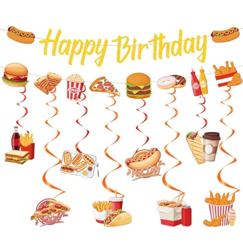 | What You Get?You Will Get 2 Exquisite Banners, 8 Fast Food Themed Hanging Swirls; Come And Have Fun And Taste The Delicious Fast Food | | Material:Fast Food Party Birthday Decorations Are Made Of High Quality Paper, Plastic And Cardstock; Good Materials Can Enhance Your Party Experience, Come Together For A Delicious Meal | | Fast Food Party Decoration:In The Party, Fresh Pizza And Delicious Hotdogs Are Combined To Create A Tantalizing Visual Feast; Each Bite Brings You A Unique Flavor | | How To Use: String Our Fast Food Banners On The Ceiling Or Windows, Then Use The Hanging Swirls To String Them Wherever You Want To Place Them; Next You Will Get A Great Fast Food Party | | Widely Used: Fast Food Decorations Are Suitable For Birthday Fast Food Party, Fried Chicken Party, Pizza Party, Food Lovers Party And Other Occasions; Come And Enjoy The Delicious Food With Your Family And Friends | |