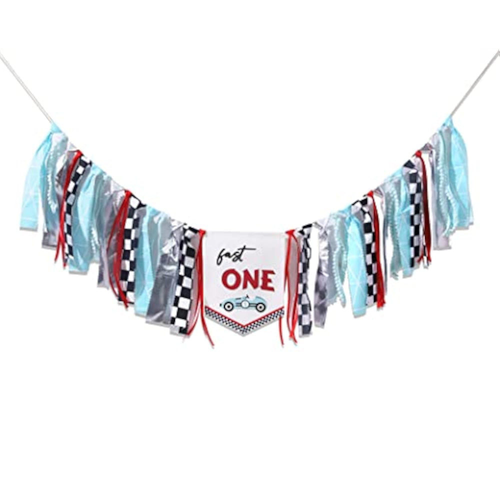 Celebrate your little racer’s 1st birthday with the “Fast One” Vintage Race Car High Chair Banner! Featuring colorful ribbons and a race car flag centerpiece, this unique banner adds a fun, vibrant touch to any party. Perfect as a high chair decoration, party centerpiece, or photo prop, it’s an easy way to bring excitement and style to your race car-themed celebration.