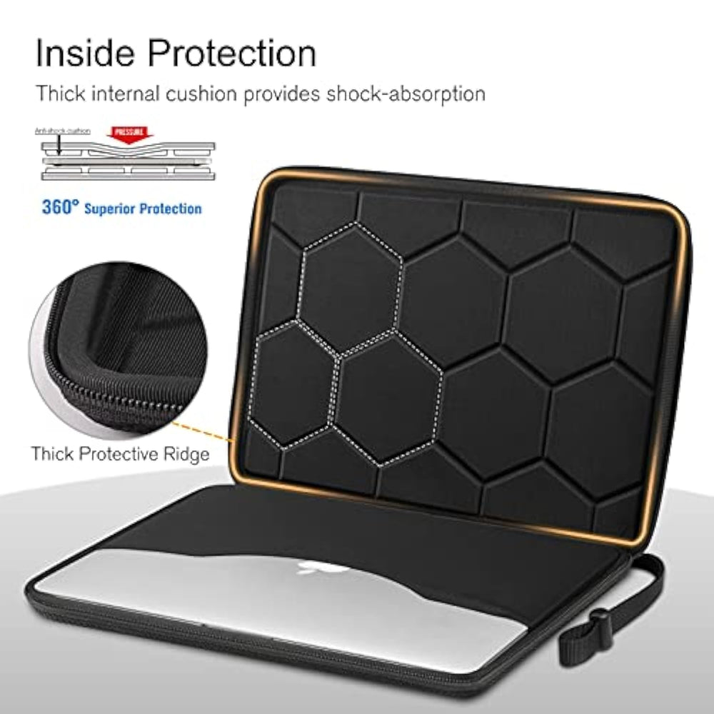 | Compatible with 15.3-inch MacBook Air M2 A2941 (2023 Release, Snugly fit), HP Chromebook 14 / Stream 14 / HP Pavilion x360 14, 15 inch MacBook Pro 2016-2019, Acer Chromebook 14 / Acer Swift 3/1 Spin 3 / Acer Chromebook 14, Dell Inspiron 14 / Dell Latitude E7470, and most 13.5-14" Laptops. | | This sleeve is meticulously designed with a semi-hard EVA shell and anti-scratch polyester material. Its combination ensures an all-round protection for your laptops, safeguarding them from external shocks, bumps, scratches, scuffs and spills. | | This laptop sleeve equips with premium spill-resistant exterior, shockproof soft foam air cushion interior, provides 360° all-around protection, uniting quality, durability, and simplicity in its design. | | Internal Dimension: 13.7 x 9.5 x 0.8 inches (L x W x H). External Dimension: 14.5 x 10.5 x 1.5 inches (L x W x H), this computer laptop bag perfectly fits for 13.5-14" laptops and beneath. | | This laptop Slim Sleeve Bag is ideal for business, school and travel. Slim, portable and lightweight to take alone, or slide it into your briefcase, backpack or any other bag. | |