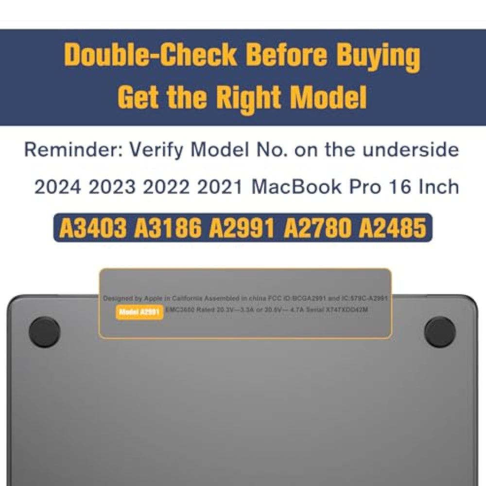 | ?Compatibility?Compatible with MacBook Pro 16 Inch 2021 2022 2023 2024 Release A2485 A2780 A2991 A3186 A3403 M1 Pro / M1 Max / M2 Pro / M2 Max / M3 Pro / M3 Max / M4 Pro / M4 Max Chip with Liquid Retina XDR Display Touch ID. Not compatible with other models. Please check the model number on the back of the laptop before purchasing. | | Precise cut-outs, seamless fit: designed for the MacBook Pro 16 inch, this case is shaped by micro 3D cutting technology according to the original MacBook. It fits snugly like a second skin, allows easy access to all ports and ensures smooth opening and closing. Ultra micro clip design allows easy installation and removal. | | Exclusive midnight design, just like the naked MacBook: With high-precision matte finish and repeated colour adjustments, this case fits perfectly with your 13.6 inch MacBook Air and preserves the original slim and minimalist design. In addition, the oleophobic nano coating can effectively reduce fingerprints, dirt and scratches and keep the device looking new and clean for a long time. | | Effective shock protection, slim and lightweight: made of powerful impact-resistant materials, our case can effectively protect your MacBook while showing its original beauty. | | Please check the model number "Axxxx" on the back of the laptop before your purchase, make sure the model number is "A3403 or A3186 or A2991 or A2780 or A2485". | |