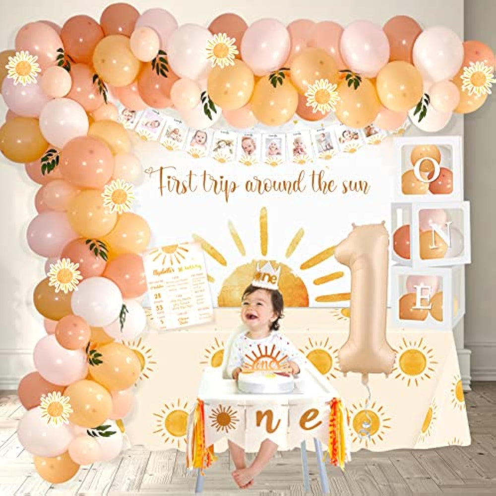 First Trip Around The Sun 1St Birthday Party Decorations - Package Includes: First Trip Around The Sun Backdrop, 3Pcs One Balloon Box, One Cake Topper, Baby Monthly Milestone Photo Banner, High Chair Banner, First Birthday Crown, Number 1 Foil Balloon, 1St Birthday Milestone Poster, 111Pcs Balloon Garland Set. | Boho Sun First Birthday Decoration - These Super Cute Boho Sun Party Decorations In Soft Muted Tones Are Perfect For A Bohemian Sunshine First Birthday Or Evens And Are Suitable To Use As A Photo Background. Place It On The Wall, Adding A Little Extra Beauty To The Party. | Unique Design - The Design Of Our Decoration Is Based On The Theme Of Sun. The Unique Retro Color System Is Combined With The Sun Element Pattern Printing, Which Will Bring You A Unique Artistic Conception And Beautiful Vision. Decorate Your Party With It And It Will Add More Sparkle To The Party. | Pay Attention - Please Do Not Inflate The Balloon More Than 90% To Avoid Sudden Popping. Also Take Care To Avoid High Temperature, Sharp Objects And Excessive Friction. Foil Balloons Cannot Float With Helium. You Can Put Them On The String Or Use Double-Sided Tape To Stick Them Anywhere You Want. |