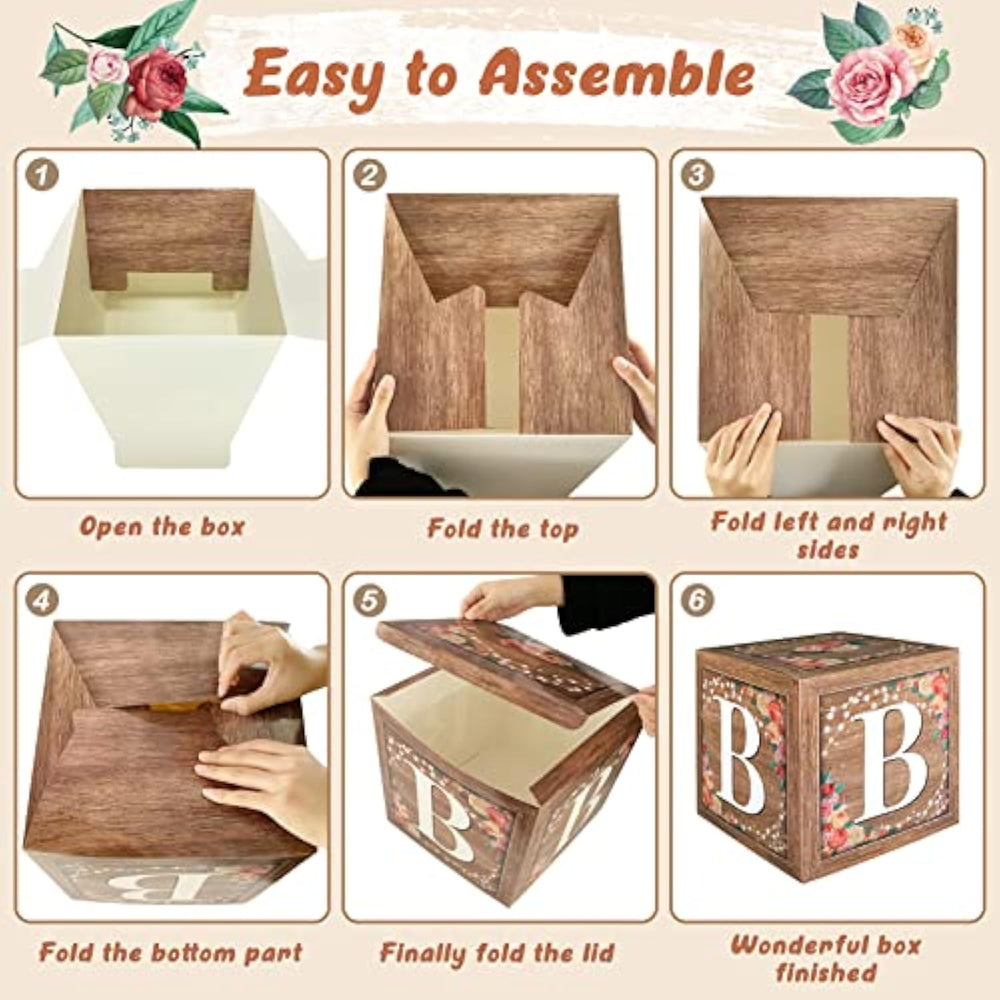 Create a charming baby shower setup with our Floral Baby Shower Decoration Boxes, featuring four wood grain-patterned blocks adorned with delicate floral designs and bold "BABY" lettering. Each box measures 11.8 x 11.8 x 11.8 inches and is made from high-quality thick cardboard with vivid, non-toxic ink printing, giving it the look of real wood. Designed for effortless assembly, these pre-folded boxes can be set up in just two minutes, making them a stylish and convenient addition to any baby shower or gender reveal celebration.
