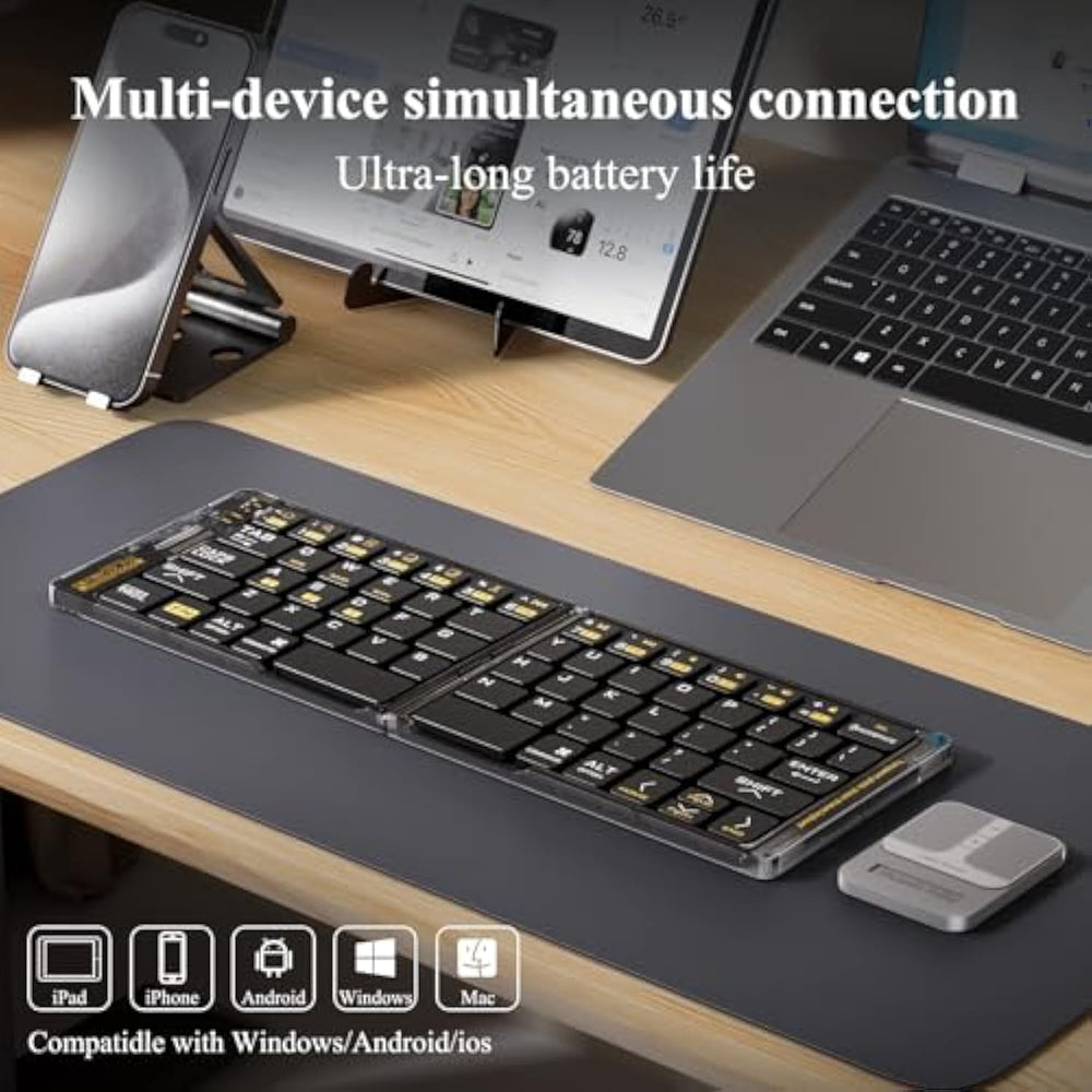 | ? Microscope Full Size Quick Access? Portable Folding Bluetooth Keyboard Has 65 Keys, Equipped With 12 Efficient Shortcut Keys (F1~F12), Numeric Keys And Multi-Function Keys, Easy To Input Data And Quick Search, Instant Access To Homepage, Switching Apps, Adjusting The Volume, Etc., Which Can Meet The Daily Work Needs And Greatly Improve The Work Efficiency. | | ?Overall Design And Components? F01 Bluetooth Keyboard And Mouse Combo'S Unique Transparent Body Design Makes The Internal Structure Visible At A Glance. The Metal Hinge Easily Realizes The Folding Effect Of F01 Bluetooth Keyboard, Which Can Be Folded Many Times And Is Not Easy To Be Damaged, The Leather Case Protects The Bluetooth Keyboard And Comes With A Mini Mouse Using The Patented Technology, A Device Stand, A Protective Case For The Keyboard, A Type-C Charging Cable And More. This Is An Ideal Portable Folding Bluetooth Keyboard And Mouse Set For Traveling, Business Office, Study, Etc. | | ?Multi-Device And Multi-System Support ?Compatible With Windows, Macos, Chrome Os, Ipados, Android And Other Operating Systems, Support For 3 Devices At The Same Time To Connect To The Use Of One Key Can Be Freely Switched Between The Connected Devices (Including Cell Phones, Laptops, Tablets, Etc.), This Folding Bluetooth Keyboard And Mouse Set With Which Is Seamlessly Compatible With, So That You Can Work At Any Time, Anywhere! Work!It Is A Great Choice For Travel Keyboard/Folding Keyboard/Ipad Keyboard And Mouse/Portable Keyboard And Mouse. | | ?Rechargeable And Long Life?Built-In Rechargeable Battery, Bluetooth Foldable Keyboard And Mouse Can Be Recharged By The Included Type-C Cable. In Addition, The Auto-Sleep Function Automati
