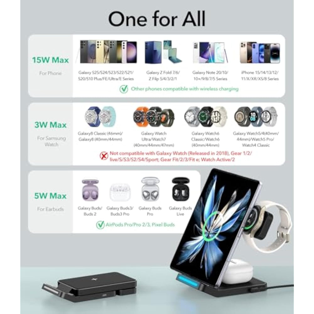 | Foldable And Travel-Friendly Design: This Travel Wireless Charging Station Adjusts From 0°-65° For Vertical Or Horizontal Phone Charging. The Galaxy Watch Charging Stand Rotates 180° Backward For Easy Storage. When Folded, It’S Compact And Space-Saving—Smaller Than A Samsung Ultra Phone And As Thick As Two Stacked Phones—Perfect For Travel. Perfect For Home, Office, Or Travel, It Eliminates The Need For Multiple Chargers And Cables | | Rotatable Watch Charging Stand: This Samsung Galaxy Watches Charging Stand Offers Both Vertical And Horizontal Charging Modes, Allowing You To Choose Your Preferred Orientation For An Optimized Charging Experience. The Vertical Mode Lets You Place It On Bedside Table For Easy Time-Checking At Any Moment. If Your Watch Has A Heavier Strap, Simply Rotate It To Switch To Horizontal Mode For More Stable Support. **Note: Not Compatible With Galaxy Watch (46Mm/42Mm), Galaxy Gear S3, S2, S | | 3 In 1 Samsung Wireless Charging Station: Provides Fast Charging Designed For Samsung Devices: 15W Max For Samsung Galaxy S25/S24/S23/S22/S21/S20/S10 Plus/Fe/Ultra/E Series, Galaxy Z Flip/Fold Series, And Galaxy Note 20/10 Series; 3W Max For Samsung Galaxy Watch Ultra/Watch 7/Watch 6 Classic/Watch 6, Watch 5 Pro 45Mm/Watch 5, Watch 4/Watch 4 Classic, Watch 3; 5W Max For Galaxy Buds Pro 3/Buds Live/Buds Plus/Buds 2. Also Compatible With Other Brands’ Phones And Buds That Support Wireless Charging | | Premium Material, Safe And Fast Charging: The Surface Is Made Of High-Quality Skin-Friendly Material And Anti-Slip Silicone To Protect Your Device Every Time. The Built-In Smart Chip Can Protect Your Phone From Overheating, Overcharging, Overvoltage And Overcurrent During Charging, Providing Reliable And Fast Charging Without Worrying About Damaging Your Device'S Battery | | Perfect Present And Considerate Service: Included In The Package: 3 In 1 Wireless Charger Station*1, Qc 18W Fast Charger Adapter*1, Type A-C Cable*1, User Manual*1. Pthis 3 In 1 Samsung Charging Station Not Only Enhances Your Workspace Aesthetics But Also Serves As A Thoughtful Gift For Family And Friends. For Any Inquiries, Our Dedicated Support Team Is Ready To Assist You Within 24 Hours | |