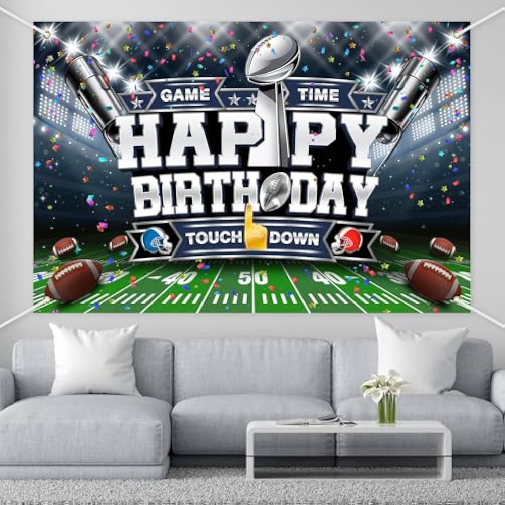 | Size: This Banner Measures Approx 72In*43In.There Are Long Ropes On The Four Corners Of The Banner, You Can Use It To Fix The Banner Conveniently. | | Suitable Scene:This Football-Themed Birthday Background Banner Is Printed With Various Elements Such As Football Field, Balloons, Etc. The Whole Design Is Exquisite And Spectacular, Creating A Strong Championship Birthday Party Atmosphere. It Is Suitable For Football-Themed Birthday Parties, Sports-Themed Parties Or Graduation Parties, So That Your Party Guests Can Fully Feel The Joyful Party Atmosphere And Quickly Enter The Party, Leaving A Good Impression On Your Guests. | | Material Technology: It Has High-Resolution Digital Printing, Eye-Catching Details, And Realistic Colors;It Is Made Of Durable Polyester Cloth, Light Weight, Thin, Easy Handling And Tear-Resistant. | | Perfect Decoration: Let’S Prepare A Nice Celebration Party For Your Families And Friends By Using This Delicate Banner. | | Service: If You Have Any Questions About Our Banners Or If You Are Not Satisfied With The Goods You Received,Please