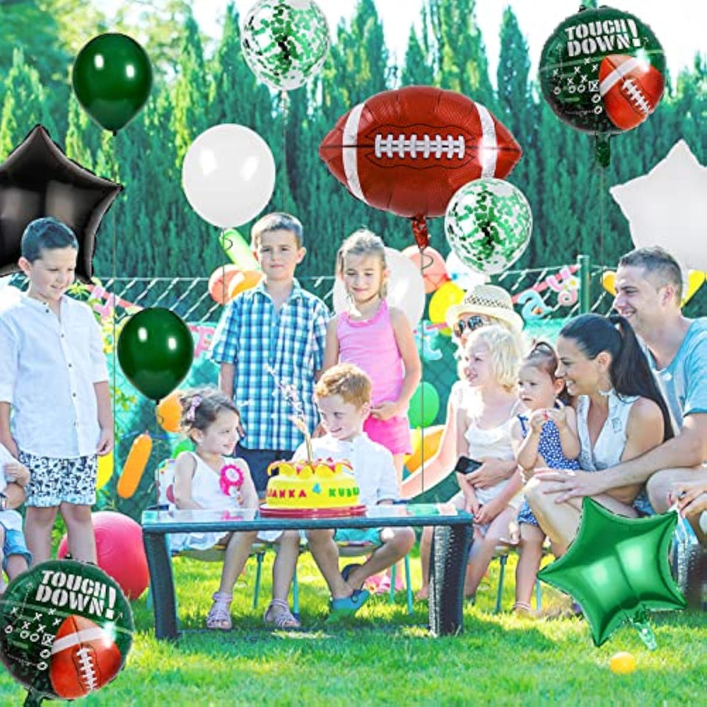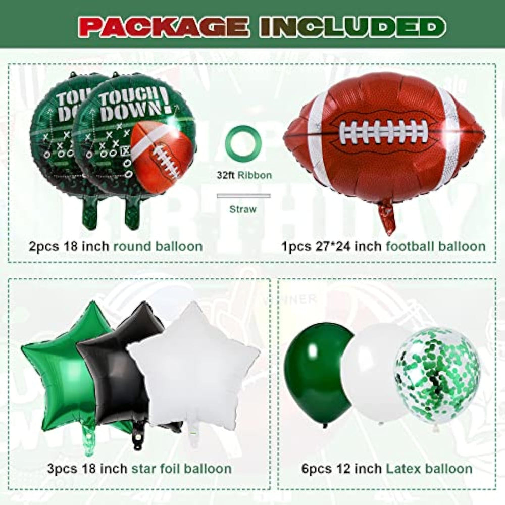 Football Balloons Set Included: 1 Pcs 27*24 Inch Football Foil Mylar Balloons,2 Pcs 18 Inch Round Foil Mylar Balloon,3 Pcs 18 Inch Star Foil Mylar Balloon(White/Black/Green?,4 Pcs 12 Inch (White,Green)Latex Balloon,2 Pcs 12 Inch Confetti Balloon(Green),1 Pcs Ribbon,1 Pcs Straw. | Widely Application: This Set Perfect For Football Theme Party, Baby Shower Party Decoration, Frist One Birthday Party,Sport Themed Party,Perfect For Super Bowl Sunday,College Football Association Party, Child Birthday Party Decoration And Other Similar Theme Parties. | Perfect Party Decoration:Balloon Is Designed With A Football Shape,Classic Colors Of Dark Green,Green,Black And White Will Create A Football Themed Atmosphere For Party And Leave Good Memories For Everyonemake Your Party A Big Hit And Awesome! | Premium Material:This Set Birthday Party Foil Balloon Was Made Of Premium Foil With Uniform Color Thick And Hard Wearing, High Quality Material. Not-Easy Burst And Safe To Use. | Easy To Use?You Can Just Use A Straw Or Pump To Blow Up The Balloons,Pinch The Balloon Mouth Flat After Inflation, They Will Seal Automati