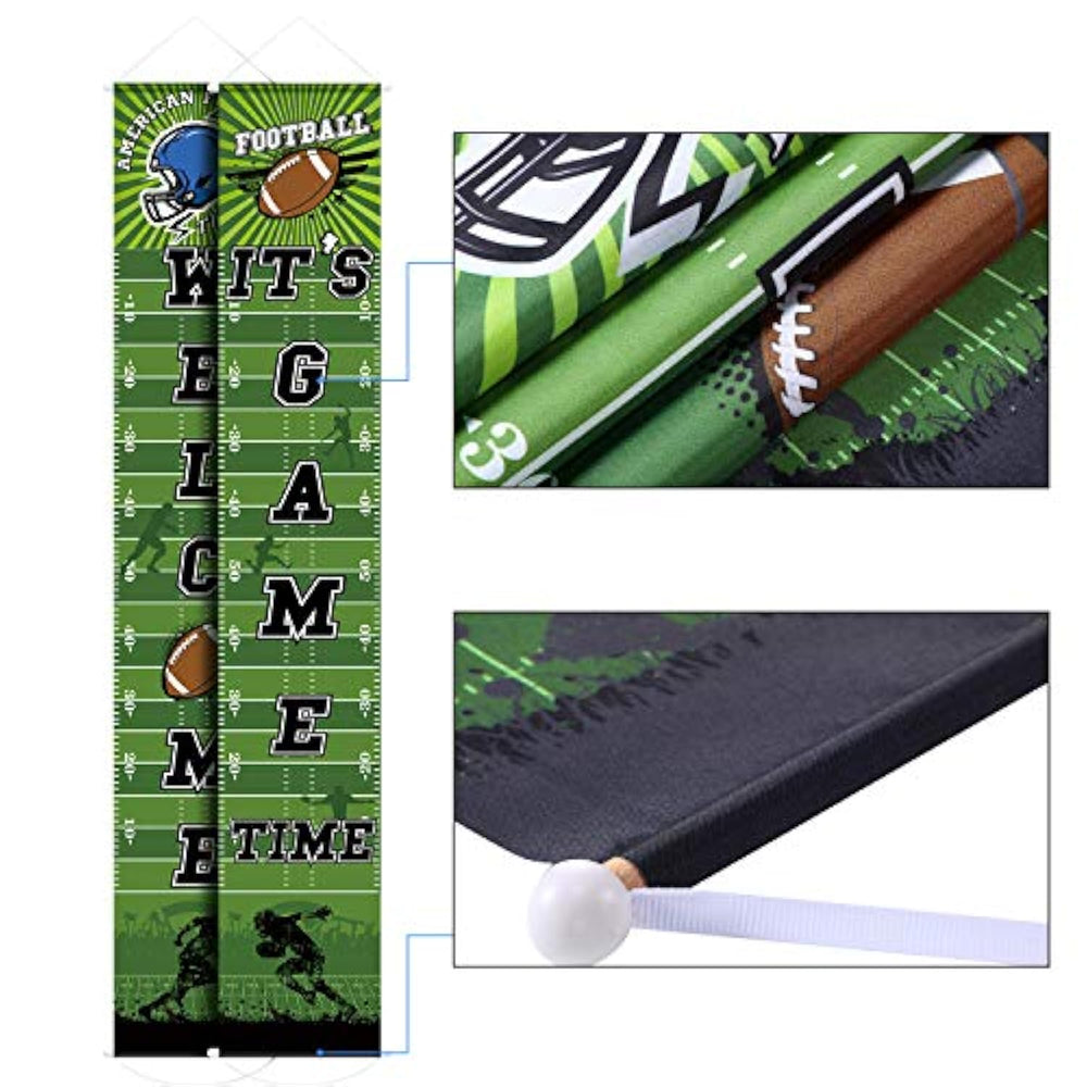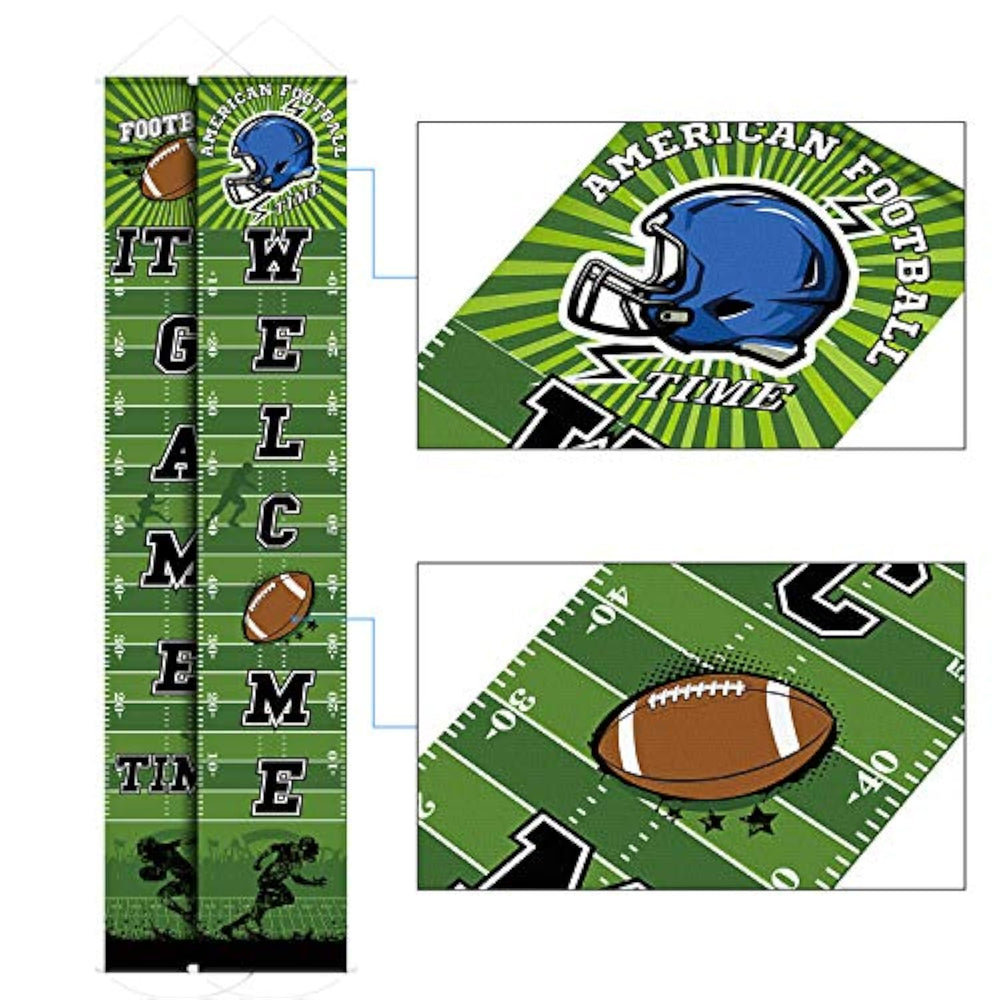 | Packing Includes: 2 Football Welcome Banners, One Is Printed With The Words Of "Welcome", Another Is "It'S Game Time", Very Vibrant And Funny | | Football Element: With Football, Sporter, Football Helmet And Other Football Elements To Decorate The Party, Birthday, Baby Shower, Sports Party, Outdoor Activity And Other Events | | Happy Football Banner Details: Made Of Polyester Fabrics With Vibrant Printing; Each Banner Is 180 X 30 Cm/ 70 X 12 Inch, Seamless, Durable, Reusable, Lightweight And Non-Fading | | Football Theme Party Decoration: The Football Welcome Banner Is Easy To Apply To Wall, Hang It At Door Side As Party Porch Sign, Decorate The Entryway, Or Suspend From Branches To Add Fun At Your Party Time | | Wide Usage: Camping Banner Is Printed With Football Element Patterns, Which Is A Funny Decoration At Birthday Party, Sports Party, Summer Camp, Baby Shower Or Photo Props | |